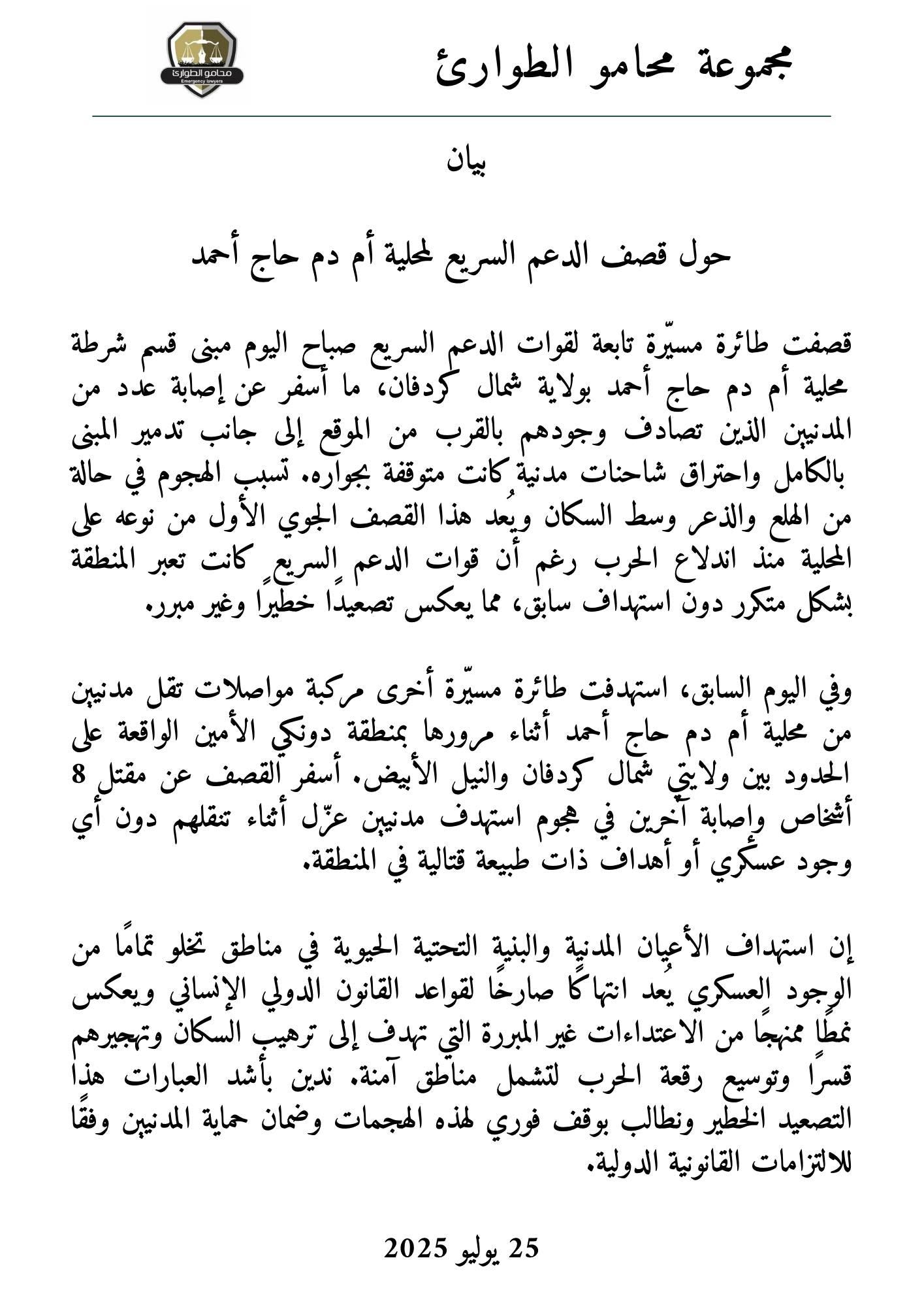 أضافت المجموعة تسبب الهجوم في حالة من الهلع والذعر وسط السكان ويُعد هذا القصف الجوي الأول من نوعه على المحلية منذ اندلاع الحرب رغم أن قوات الدعم السريع كانت تعبر المنطقة بشكل متكرر دون استهداف سابق، مما يعكس تصعيدًا خطيرًا وغير مبرر.