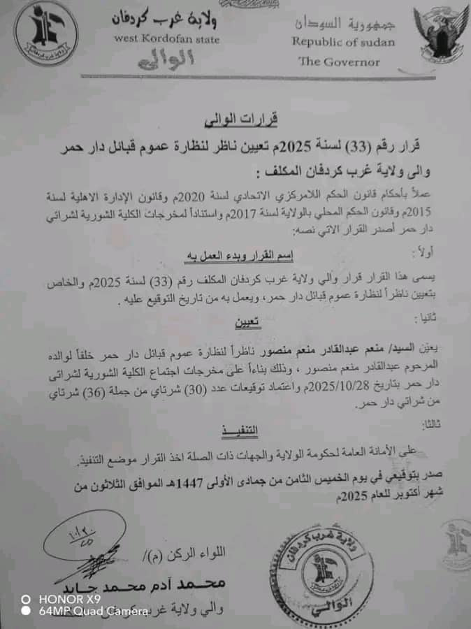 فبعد قيام قوات الدعم السريع بقيادة اللواء حامد عبدالغنى قائد قوات الدعم السريع بقطاع محليات شمال ولاية غرب كردفان بتعيين الشرتاى إسماعيل محمد الشيخ أميراً لأمارة عموم قبائل دار حَمر يوم الأربعاء الموافق ٢٩ أكتوبر ٢٠٢٥م، قام اللواء ركن حقوقى ( م ) محمد أحمد جايد والى ولاية غرب كردفان باصدار قرار يوم الخميس الموافق ٣٠ أكتوبر ٢٠٢٥م، حملَ الرقم ( ٣٣ )، قضى بتعيين السيد / منعم عبدالقادر منعم منصور ناظراً لنظارة عموم قبائل دار حَمر خلفاً لوالده المرحوم.