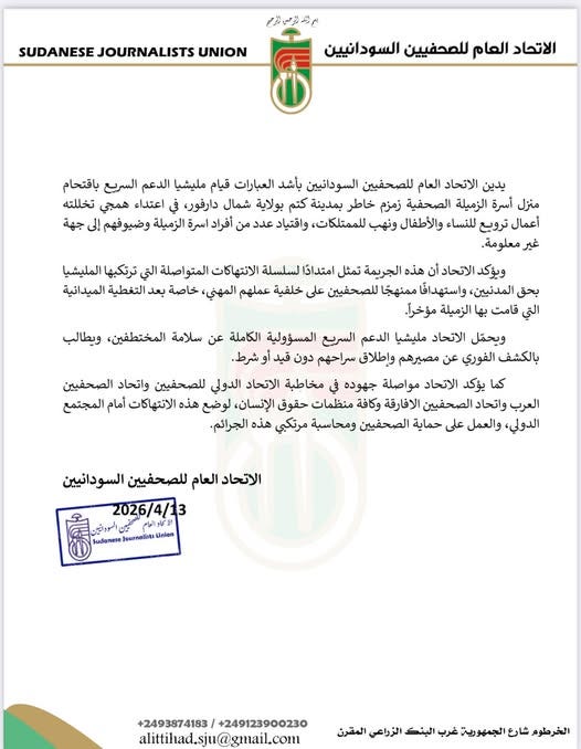 وحمل الاتحاد مليشيا الدعم السريع المسؤولية الكاملة عن سلامة المختطفين، وطالب بالكشف الفوري عن مصيرهم وإطلاق سراحهم دون قيد او شرط.