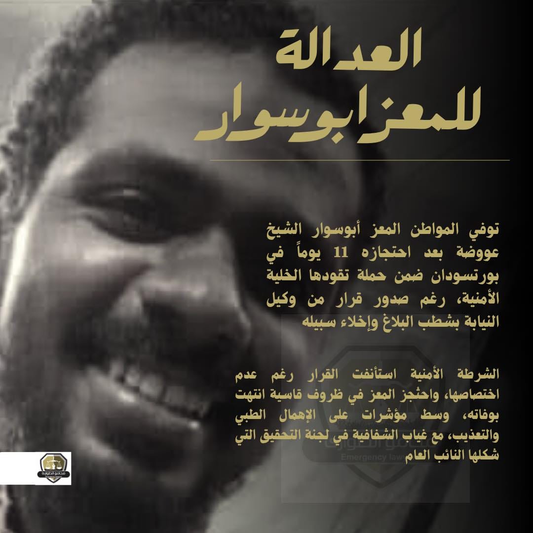 اكدت مجموعة محامو الطوارئ وفاة المواطن المعز أبو سوار الشيخ عووضة الذي كان محتجزا داخل حراسة الشرطة بمدينة بورتسودان في 12 أغسطس 2024 .