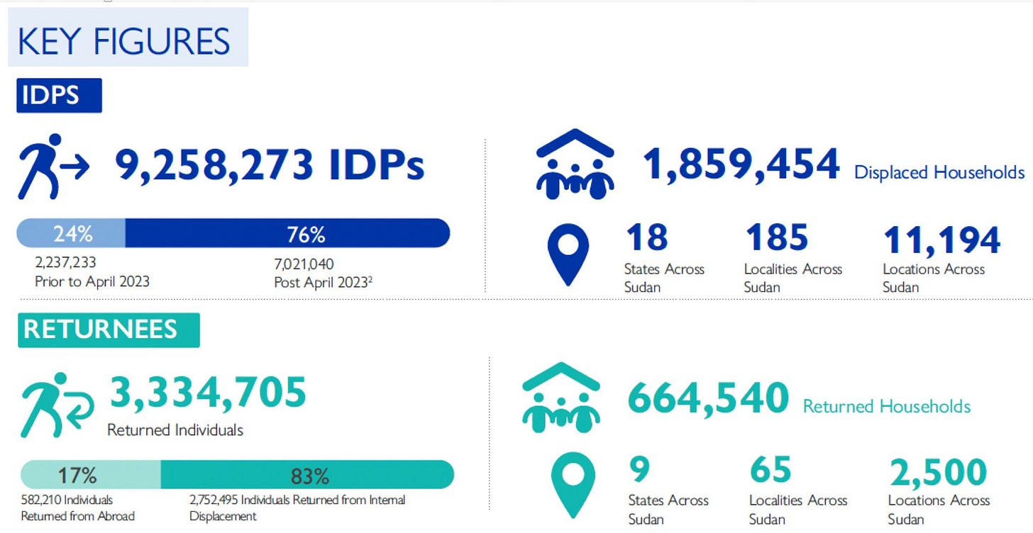 قالت المنظمة في بيان لها صدر يوم الأربعاء 28 يناير 2026، سُجِّلَ ما يُقدَّر بنحو 9,258,273 نازحًا داخليًا في 11,194 موقعًا ضمن 185 منطقة، في جميع الولايات الثماني عشرة.
