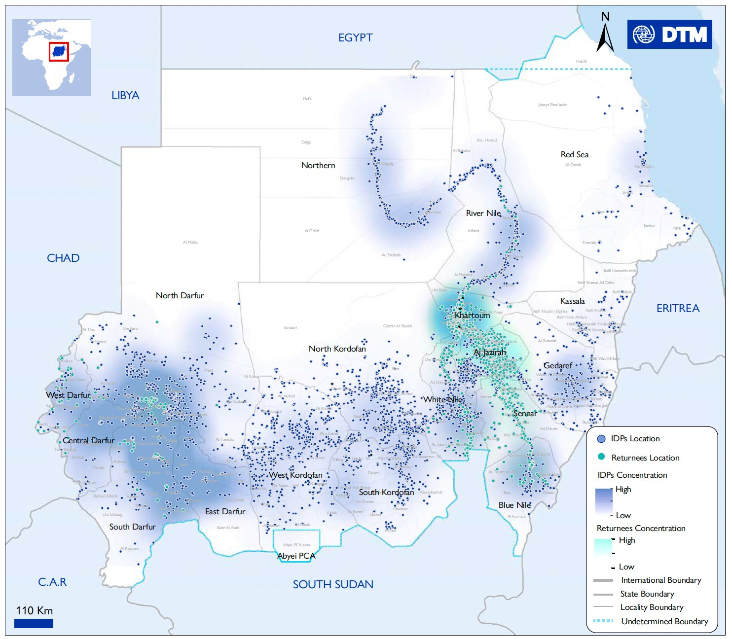 يتضمن تقرير المنظمة الدولية للهجرة لمحة عن النزوح والعودة في السودان معلومات عن النازحين داخلياً والعائدين، استناداً إلى بيانات من أكثر من 12000 موقع، و185 منطقة محلية، وجميع الولايات الـ 18 في السودان.