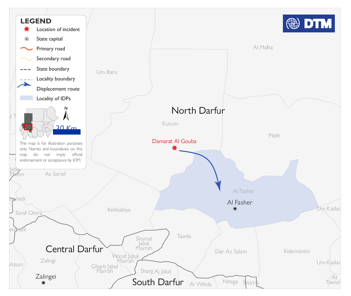 افادت المنظمة الدولية للهجرة في التاسع عشر من أبريل 2026، نزوح 115 شخصا من قرية دمرة القبة التابعة لمحلية كتم بولاية شمال دارفور، نتيجة تدهور الأوضاع الامنية في الاقليم غربي السودان.