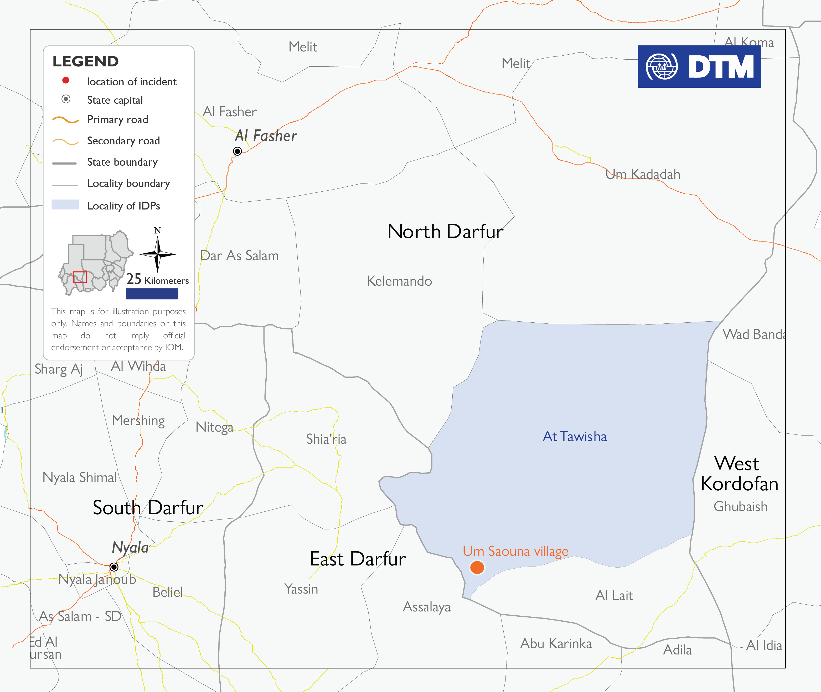 حسب البيان، نقلت الأسر المتضررة إلى مناطق مفتوحة داخل نفس المحلية، ستواصل مرصد رصد النزوح مراقبة التطورات عن كثب، وستقدم المزيد من المعلومات حول النزوح وحركة السكان في جميع أنحاء السودان.