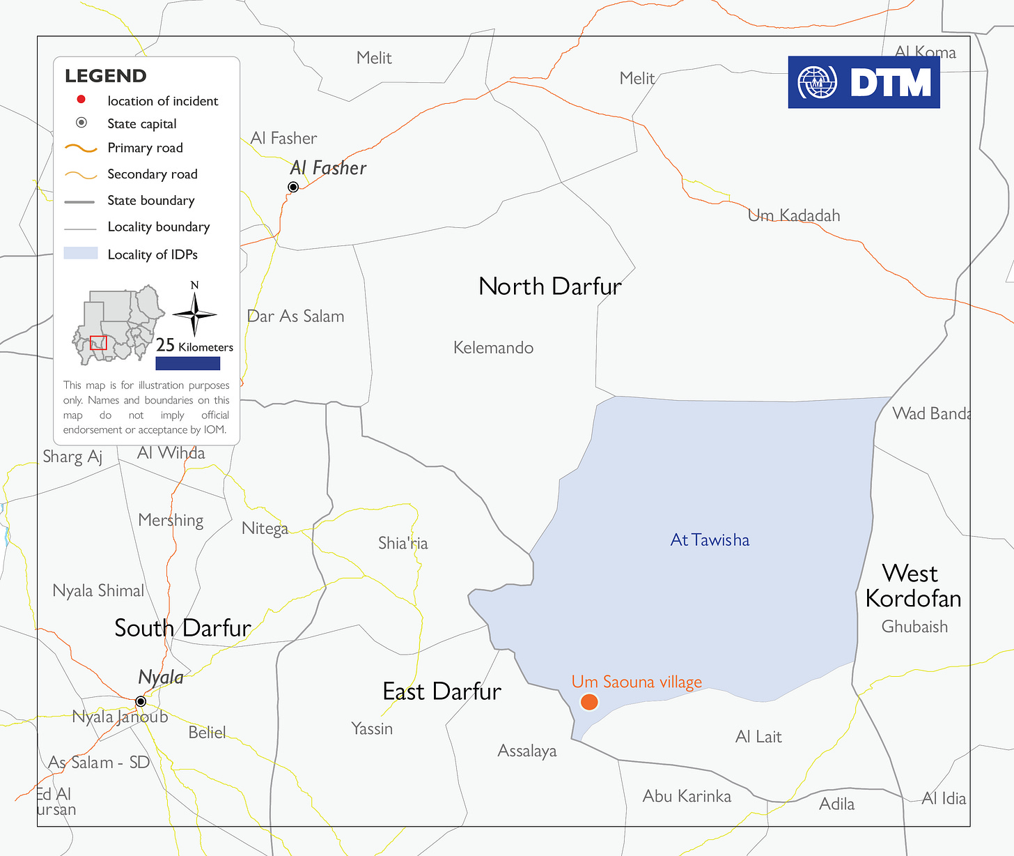 اكدت مصفوفة تتبع النزوح التابعة للمنظمة الدولية للهجرة اندلاع حريق في قرية أم سعونة بمحلية الطويشة في ولاية شمال دارفور، تسبب في نزوح 12 اسرة.