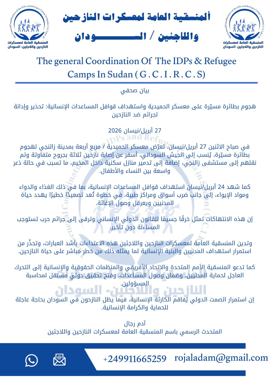 المنسقية العامة للنازحين واللاجئين تؤكد هجوم طائرة مسيرة علي معسكر الحميدية لطائرة منسوبة الي الجيش السوداني