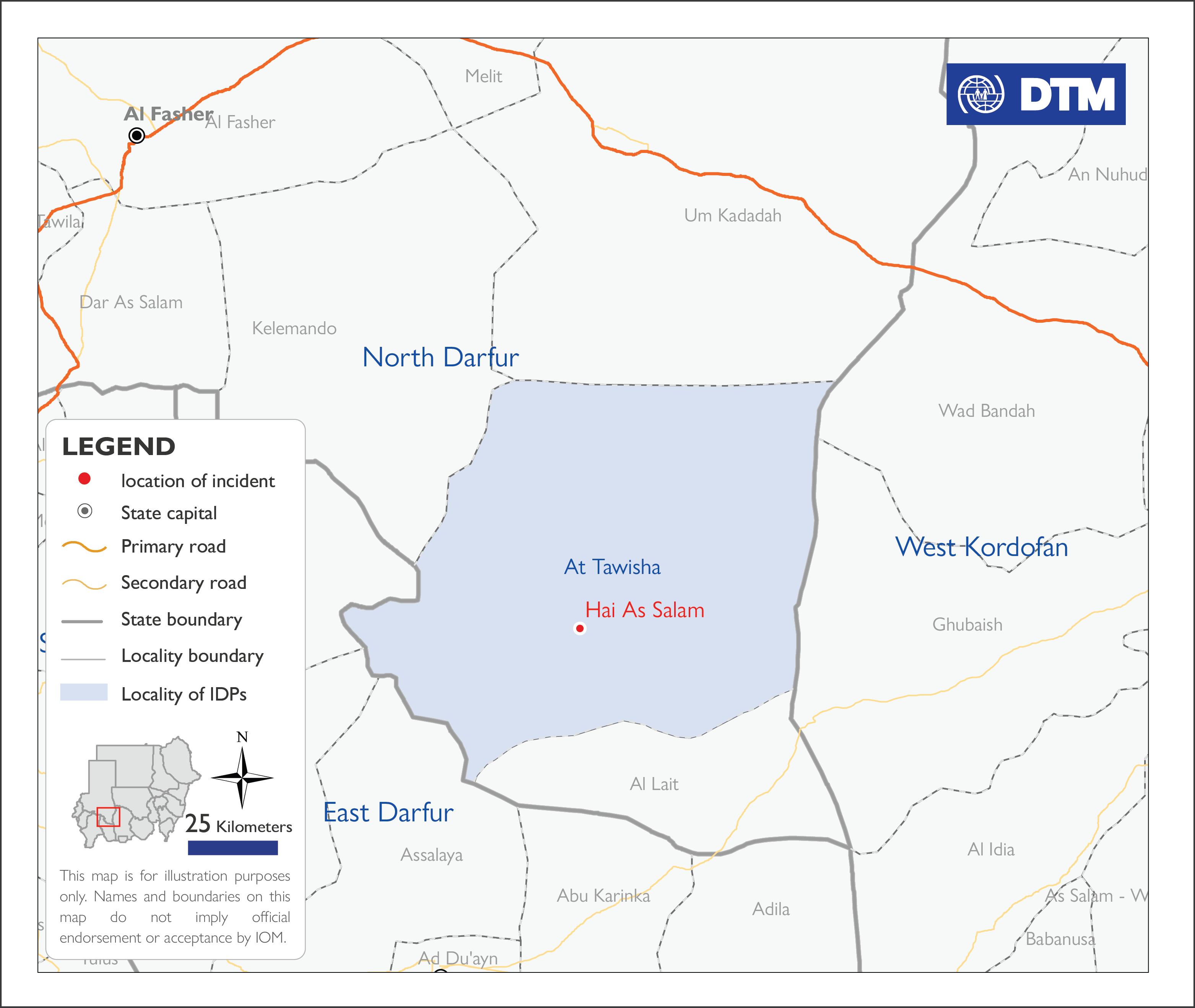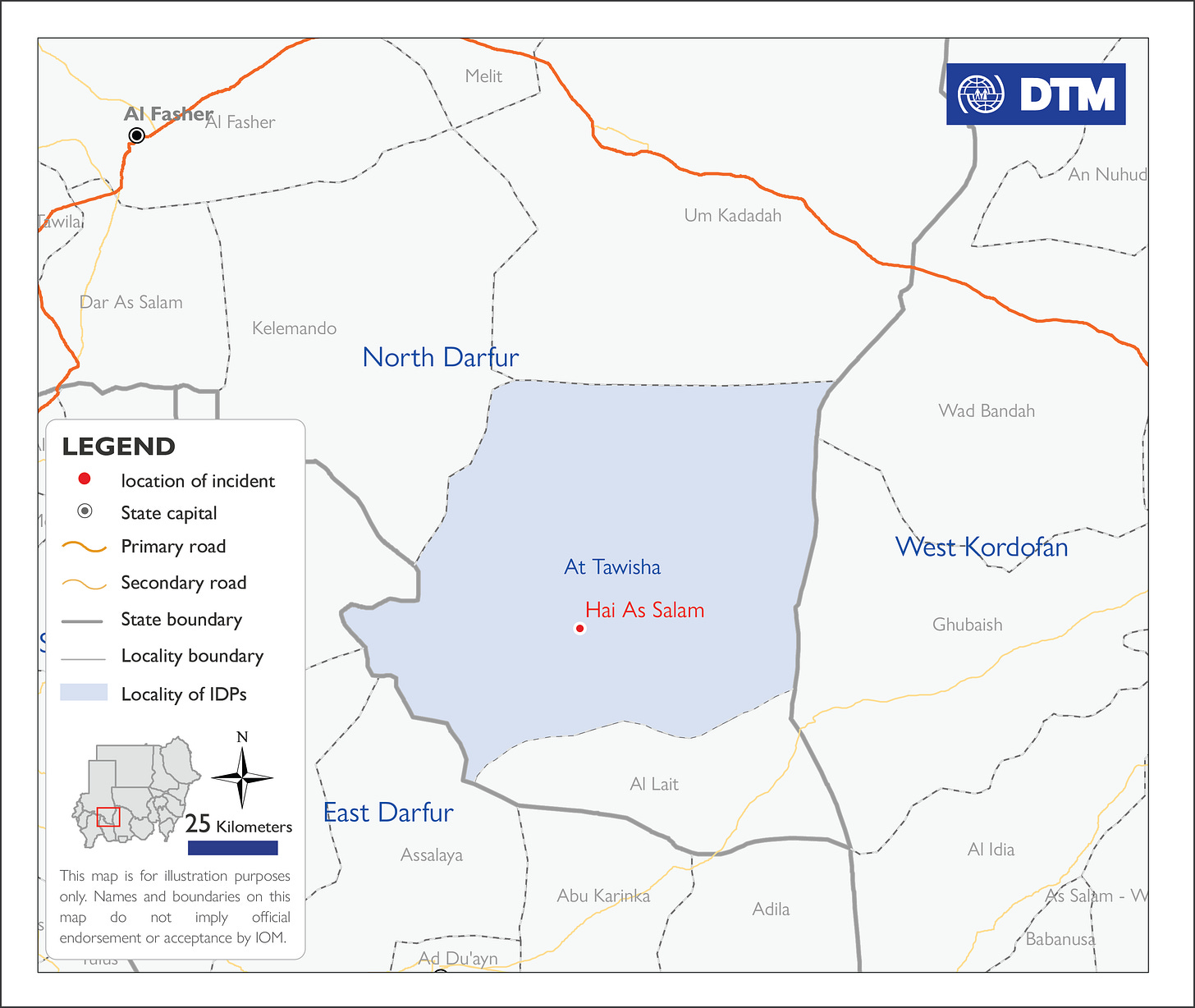 افادت المنظمة الدولية للهجرة باندلاع حريق في الحادي عشر من أبريل 2026، في حي السلام في محلية الطويشة بولاية شمال دارفور، ما أدى إلى نزوح 22 أسرة.