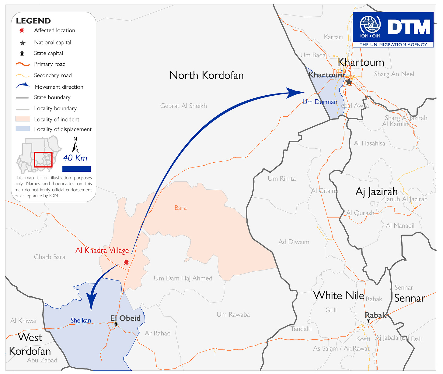 قدرت مصفوفة تتبع النزوح التابعة للمنظمة الدولية للهجرة نزوح 220 شخصا من قرية الخضرا التابعة لمحلية بارا، يوم الجمعة 27 مارس 2026 بولاية شمال كردفان، نتيجة تدهور الأوضاع الامنية واستمرار الاشتباكات العسكرية بين الجيش السوداني وقوات تحالف تأسيس.