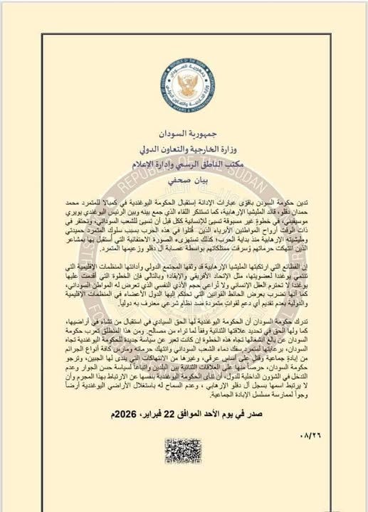 استنكر بيان وزارة الخارجية السودانية الذي صدر يوم الأحد 22 فبراير 2026، اللقاء الذي جمع بينه وبين الرئيس اليوغندي يوري موسيفيني.