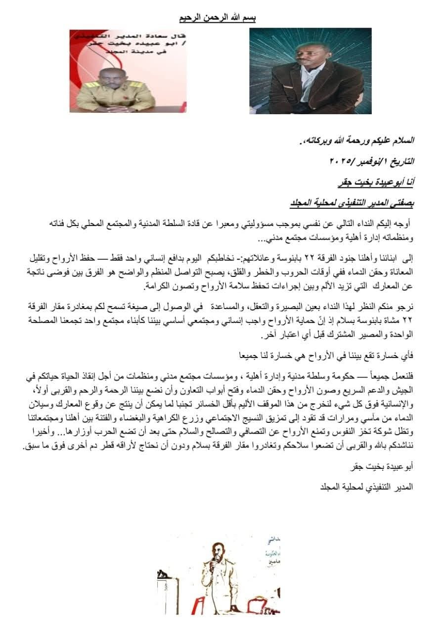 طالب الأستاذ أبوعبيدة بخيت جِقر المدير التنفيذى لمحلية المجلد بولاية غرب كردفان عن الإدارة المدنية للدعم السريع فى نداءٍ له وجههه بتأريخ السبت الأول من نوفمبر ٢٠٢٥م لضابط وجنود الفرقة ٢٢ مشاة ببابنوسة، بأنْ يضعوا السلاح ومغادرة الفرقة بسلام.