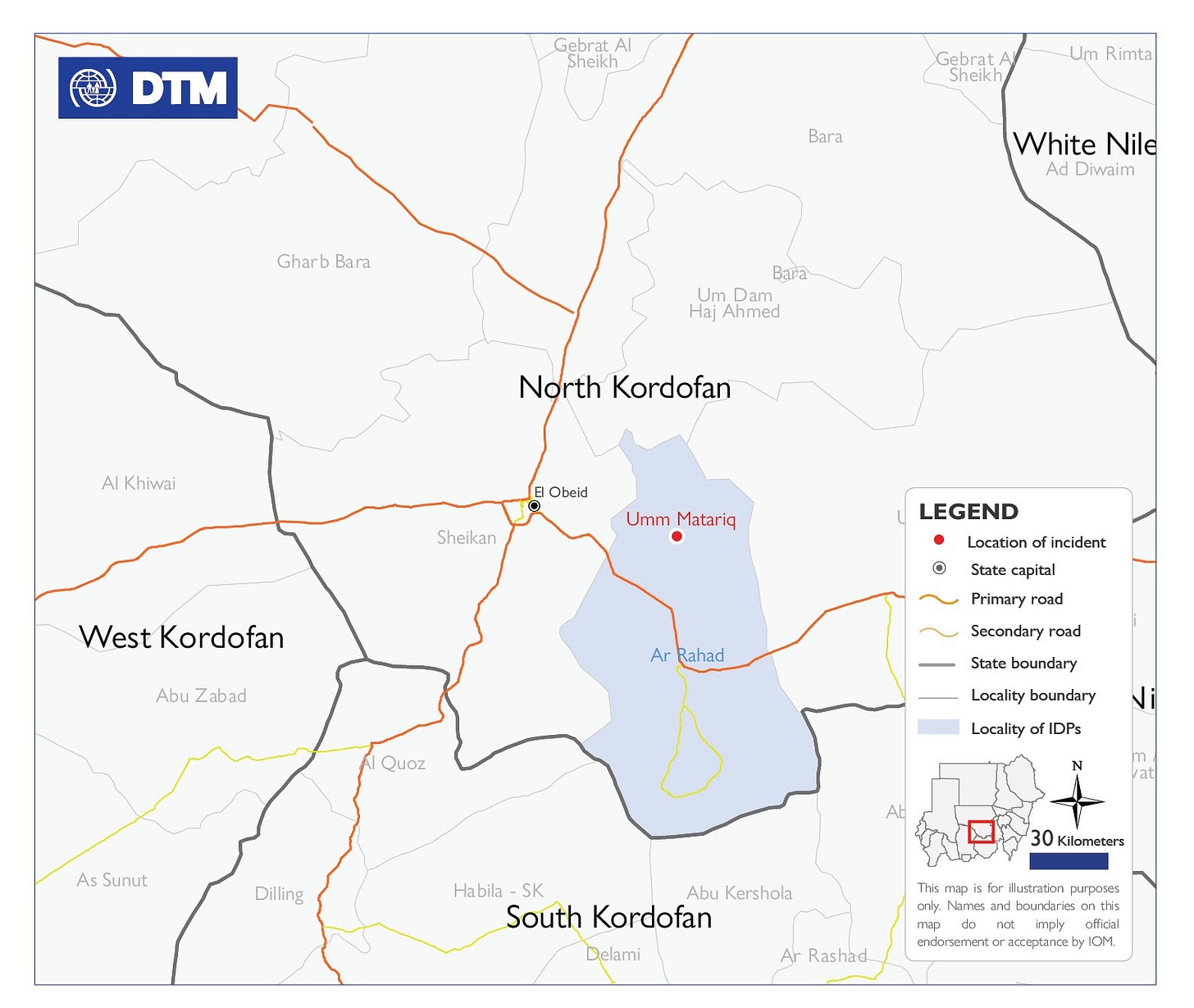 أفادت مصفوفة تتبع النزوح التابعة للمنظمة الدولية للهجرة أن الحريق الذي اندلع في قرية ام مطارق بمحلية الرهد في ولاية شمال كردفان في الثالث من مارس 2026، تسبب في نزوح 30 اسرة.