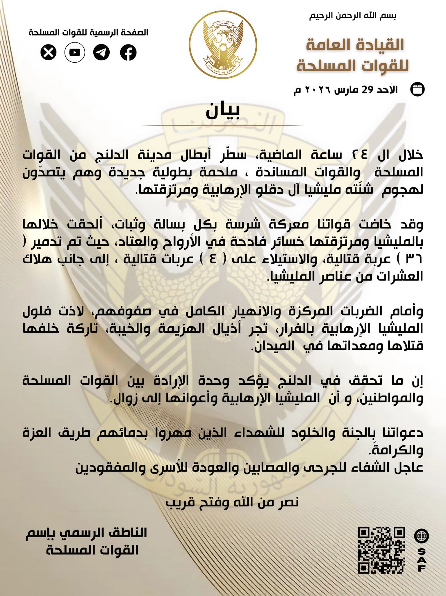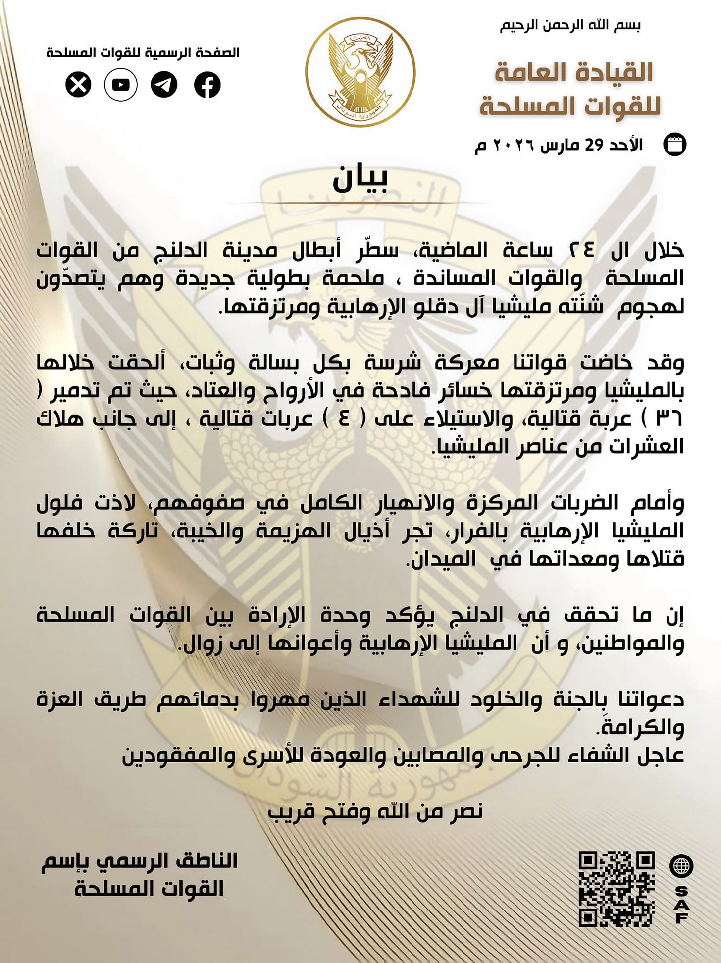 قال بيان للجيش السوداني يوم اليوم الاحد 29 مارس 2026، خلال الـ ٢٤ ساعة الماضية ’’ سطّر أبطال مدينة الدلنج بولاية جنوب كردفان من القوات المسلحة والقوات المساندة ، ملحمة بطولية جديدة وهم يتصدّون لهجوم شنّته مليشيا آل دقلو الإرهابية ومرتزقتها ‘‘.