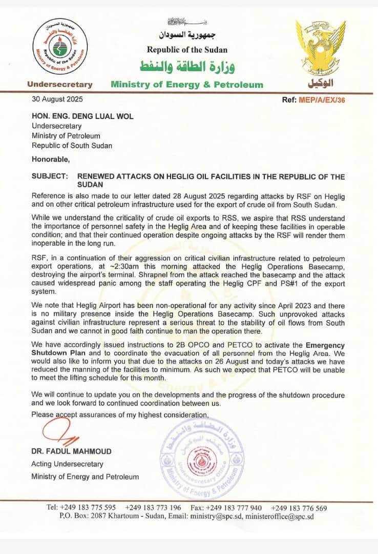 وفى رسالةٍ بعثَ بها المهندس فضل محمود وكيل وزارة الطاقة السودانية إلى نظيره بدولة جنوب السودان بتأريخ السبت ٣٠ أغسطس ٢٠٢٥م، أخطره فيها بأن انسياب نفط جنوب السودان قد يتوقف بسبب المهددات الأمنية، كما أشار الوكيل إلى اصداره تعليمات لشركتى بترولاينز التى تُشرف على ضخ نفط دولة جنوب السودان عبر السودان من خط هجليج، وشركة بابكو التى تُدير خط الجبلين _ العيلفون _ بورتسودان ، لتفعيل خطة الاغلاق الطارئ والتنسيق لإجلاء الموظفين من منطقة هجليج ، كما تمّ إبلاغ الشركتين بتخفيض عدد العاملين للحد الأدنى. وتوقع الوكيل بألا تتمكن شركة بترولاينز من الوفاء بجدول الرفع لهذا الشهر، مؤكداً أنّ استمرار تشغيلها رغم الهجوم المستمر ، سيجعلها غير صالحة للتشغيل على المدى الطويل.