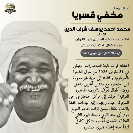 قالت مجموعة محامو الطوارئ، تمر ٣٨٩ يومًا على الاختفاء القسري للمواطن محمد أحمد يوسف شرف الدين، الإمام المعروف بمنطقة الفتيح العقليين جنوب الخرطوم.