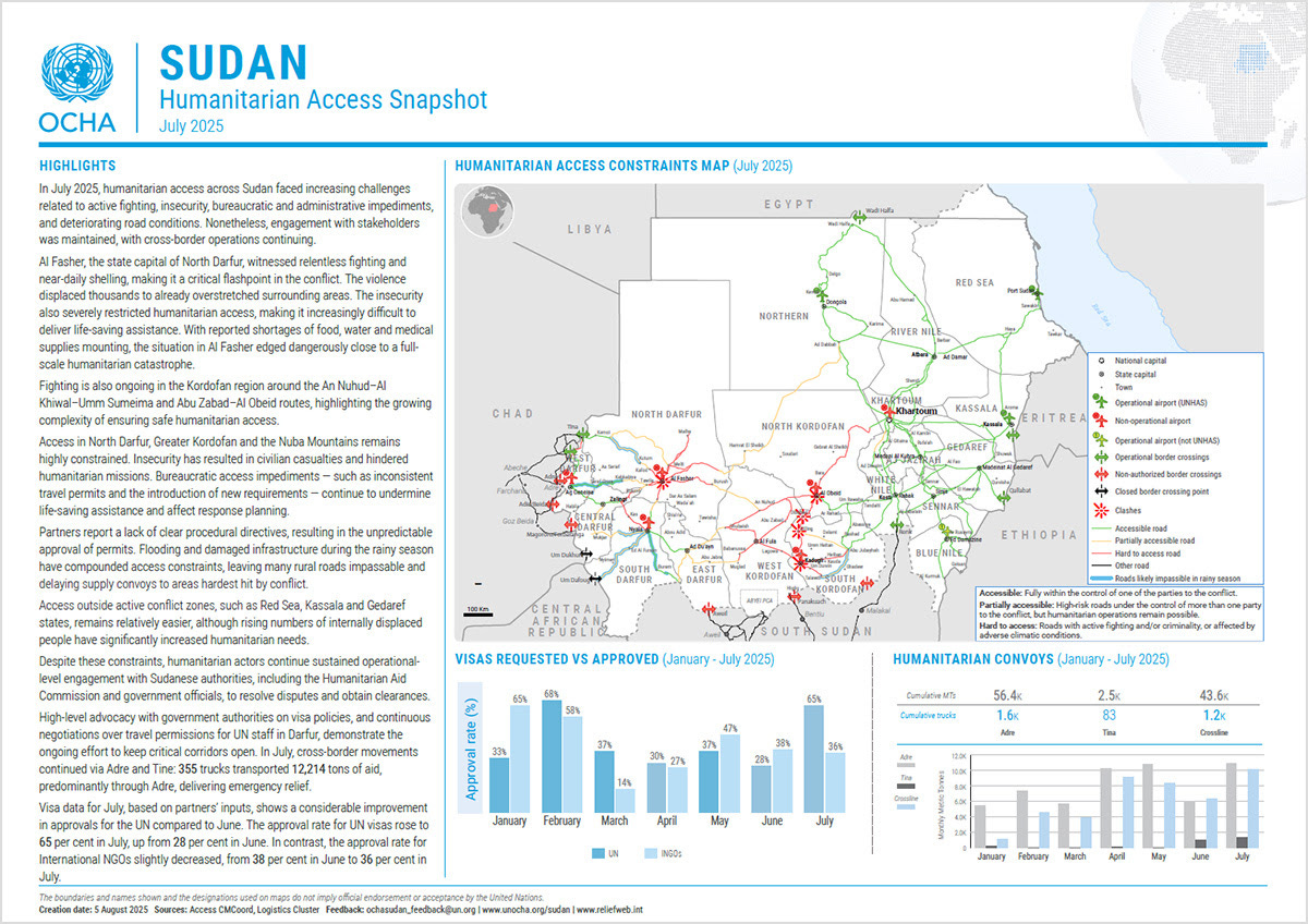 أكد مكتب الأمم المتحدة لتنسيق الشؤون الإنسانية ’’ أوتشا ‘‘ في شهر يوليو الماضي، واجهت عملية وصول المساعدات الإنسانية في جميع أنحاء السودان تحديات متزايدة تتعلق بالقتال الدائر، وانعدام الأمن، والعوائق البيروقراطية والإدارية، وتدهور حالة الطرق.