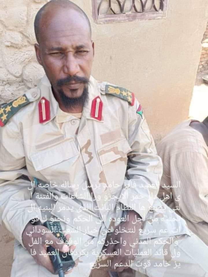 اضاف اللواء تصّدت لهم قواتنا بقطاع غبيش، وخاضت معهم معركة حامية الوطيس أدّت إلى مقتل العميد فايز حامد قائد العمليات العسكرية بقوات الدعم السريع بقطاع غبيش وخمسة أفراد آخرين من قواتنا الباسلة وإصابة ٣٠ فرداً من قواتنا بجروحٍ طفيفة، وخطيرة تمّ اسعافهم الى مستشفى مدينة غبيش لتلقى العلاج اللازم.