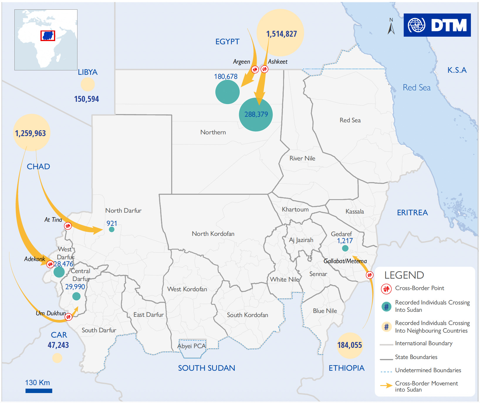 في ذات الوقت، سجل مرصد رصد الهجرة الأفراد الذين عبروا إلى السودان عبر ست نقاط عبور حدودية، وهي، أديكونك في ولاية غرب دارفور، الجنينة، أم دخن في وسط دارفور، الطينة في شمال دارفور، على الحدود مع تشاد، أشكيت وأرقين في الولاية الشمالية على الحدود مع مصر، القلابات في ولاية القضارف، على الحدود مع إثيوبيا.