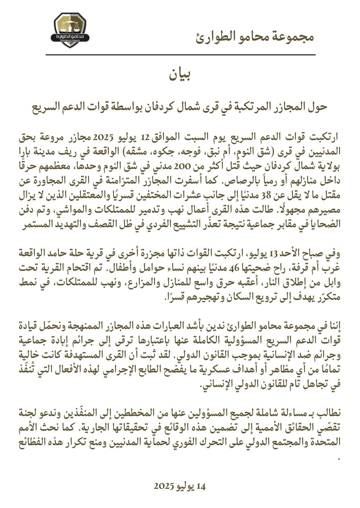 اكدت مجموعة محامي الطوارئ في بيان لها يوم الاثنين 14 يوليو 2025، أن قوات الدعم السريع ارتكبت يوم السبت 12 يوليو مجازر مروعة بحق المدنيين في قرى (شق النوم، أم نبق، فوجه، جكوه، مشقه) الواقعة في ريف مدينة بارا بولاية شمال كردفان حيث قُتل أكثر من 200 مدني في شق النوم وحدها، معظمهم حرقًا داخل منازلهم أو رمياً بالرصاص، حسب ما جاء في البيان.