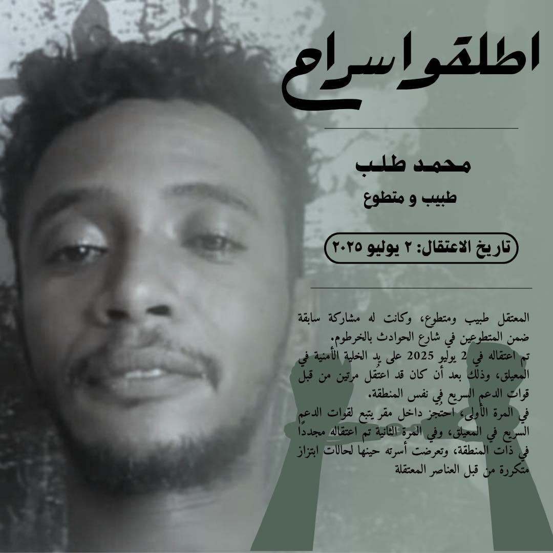 اكدت مجموعة محامي الطوارئ ان الخلية الامنية في مدينة المعيلق بولاية الجزيرة اعتقلت الدكتور محمد طالب يوم الأربعاء 2 يوليو 2025، دون أي سند قانوني أو أمر قبض معلن، ودون تمكينه من حقوقه القانونية.