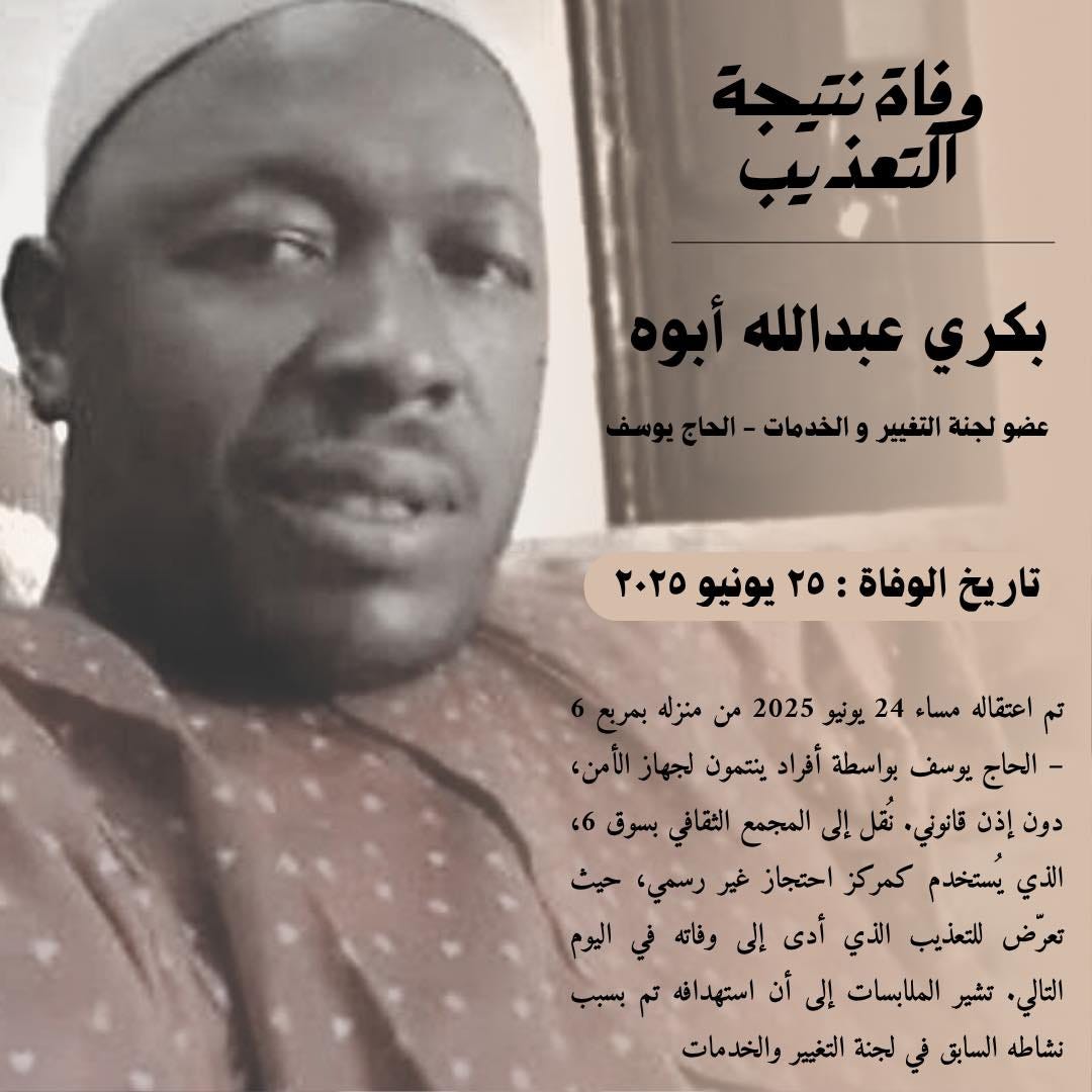 قالت مجموعة محامو الطوارئ أن بكري عبدالله ابكر ابوه عضو لجنة التغيير الخدمات بحي مربع 6 الوحدة الحاج يوسف محلية شرق النيل، توفي تحت التعذيب يوم الأربعاء 25 يونيو 2025.