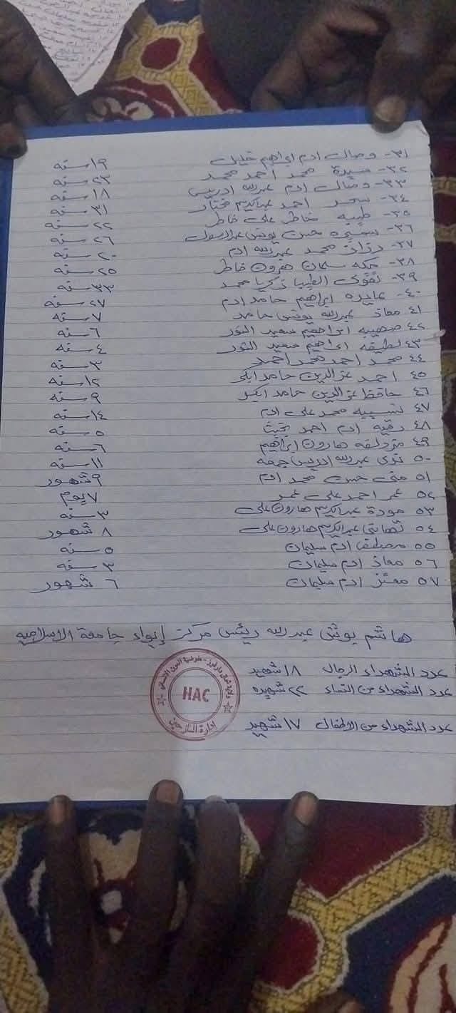 تشير التقارير الأولية إلى أن القصف الصاروخي بالمسيرات والمدفعية علي دار الارقم للنازحين بجامعة ام درمان الاسلامية بمدينة الفاشر، ادى الى مقتل 57 شخصا، بينهم 17 طفلًا (منهم 3 رُضّع) و 22 امرأة، إضافة إلى 21 جريحًا بينهم 5 أطفال و7 نساء، معظمهم أصيبوا بجروح خطيرة.