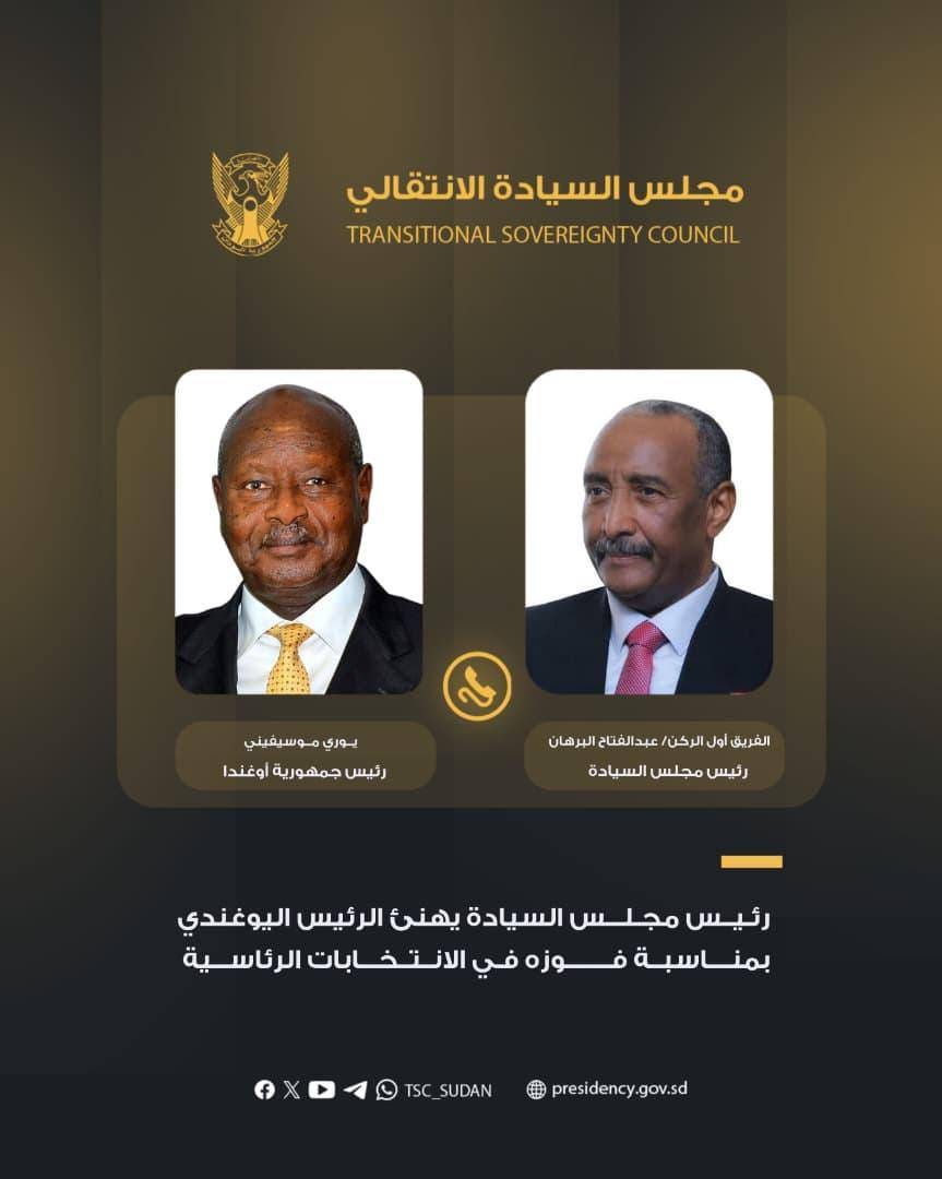 هنأ البرهان فيه موسيفيني بإعادة انتخابه رئيسا لجمهورية يوغندا لولاية رئاسية جديدة، حسبما ذكر اعلام مجلس السيادة الانتقالي.