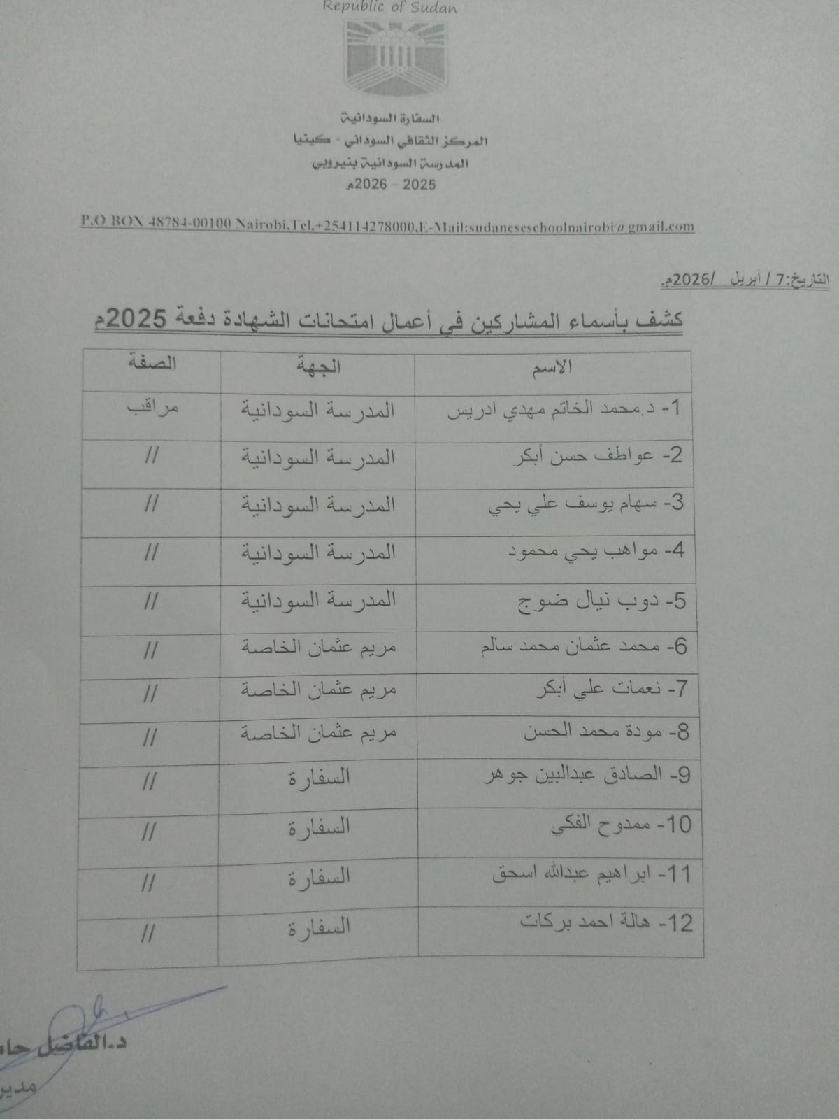 اصدر المركز الثقافي السوداني التابع للسفارة السودانية بالعاصمة الكينية نيروبي، المدرسة السودانية، يوم الثلاثاء 7 أبريل 2026، كشفا بأسماء المشاركين في أعمال امتحانات الشهادة السودانية دفعة 2025.