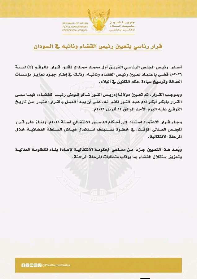 وبتأريخ الأحد ١٢ أبريل ٢٠٢٦م ، أصدر الفريق أول محمد حمدان دقلو قراراً حملَ الرقم ( ٤ ) لسنة ٢٠٢٦م ، بتعيين مولانا إدريس النور شالو كومنى رئيساً للقضاء و سمّى القرار بابكر أبكر آدم عبدالنور نائباً له.