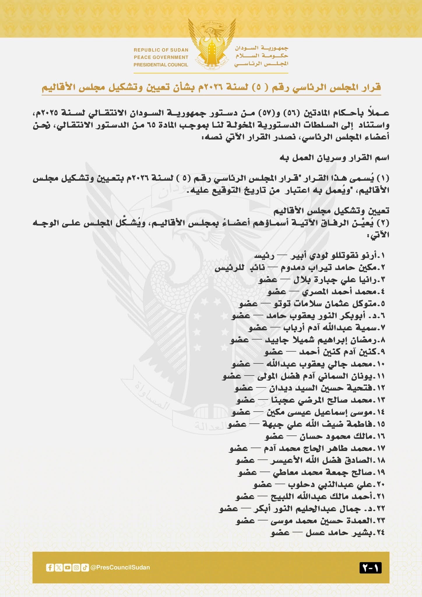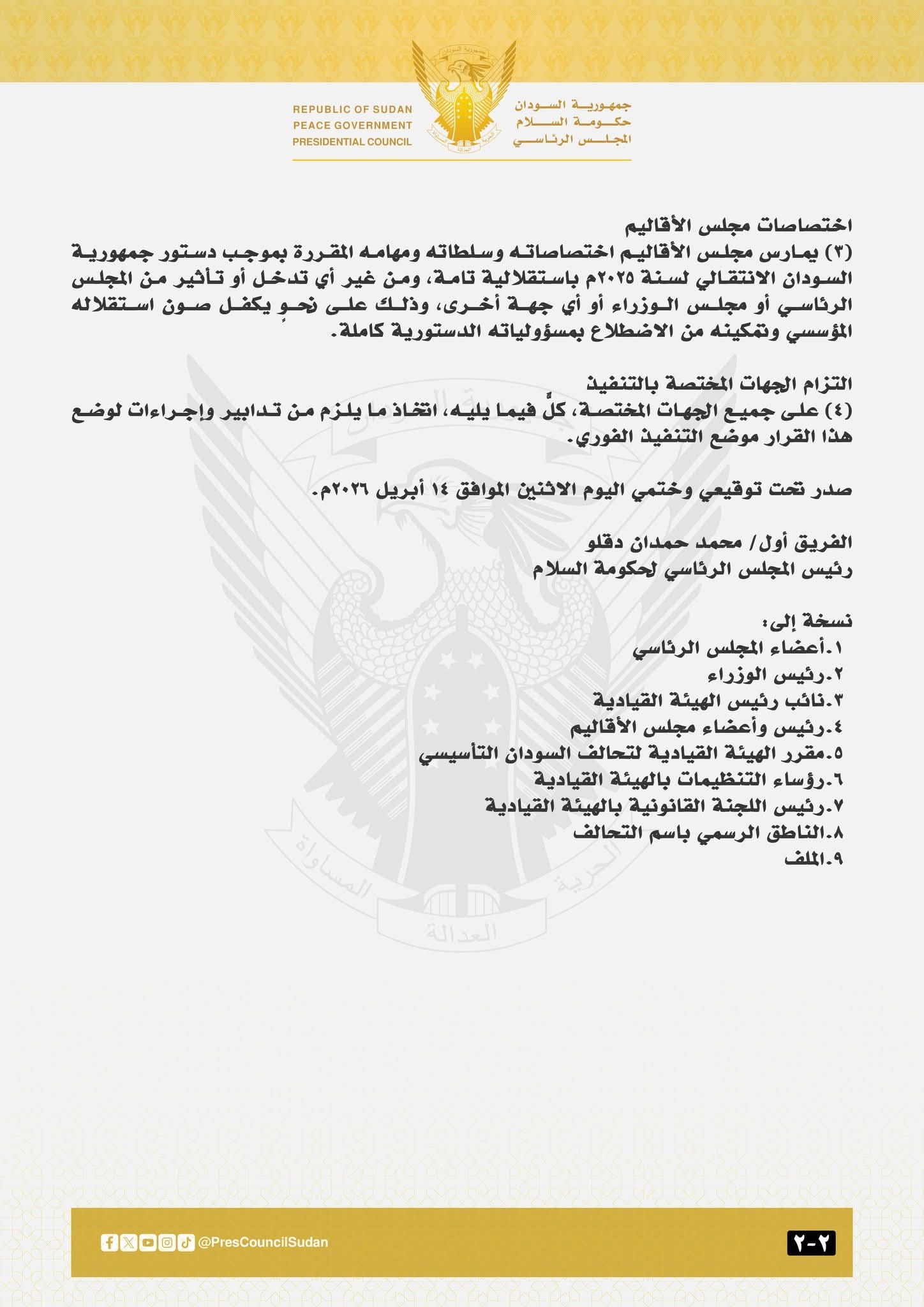 أصدر الفريق أول / محمد حمدان دقلو ( حميدتى) رئيس المجلس الرئاسى لحكومة السلام والوحدة ، اليوم الإثنين الموافق ١٤ أبريل ٢٠٢٦م ، عملاً بأحكامِ المادتين ( ٥٦ ) و ( ٥٧ ) من دستورِ جمهورية السودان الانتقالي لسنة ٢٠٢٥م واستناداً إلى السلطات الدستورية المخولة للمجلس الرئاسى بموجب المادة ( ٦٥ ) من ذاتِ الدستور ، قراراً بتشكيلِ وتعيين مجلس الاقاليم من ٢٤ عضواً بينهم ٤ عضوات وهم :