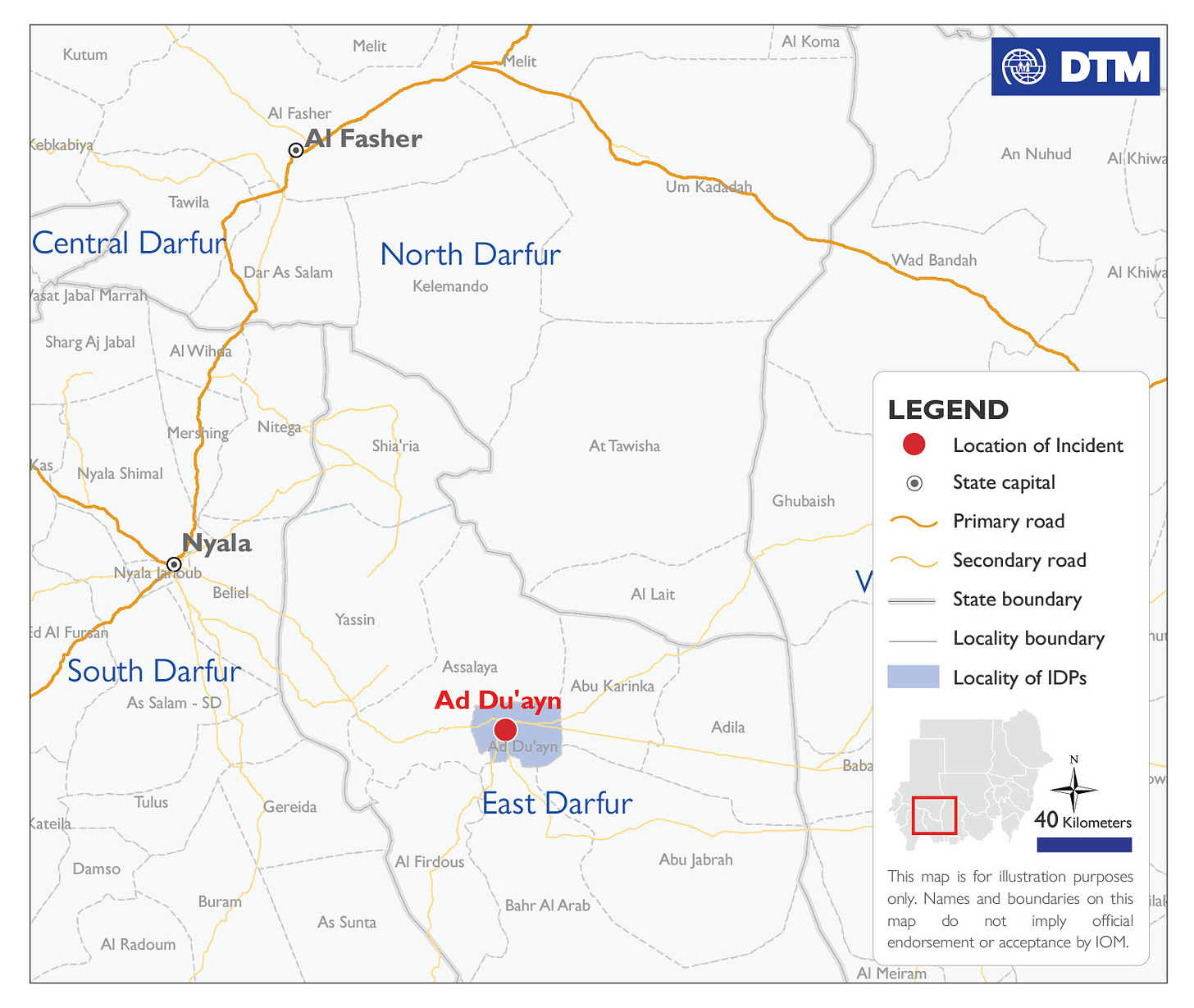 أفادت منظمة الهجرة الدولية يوم الاثنين 6 أبريل 2026، باندلاع حريق في مخيم النعيم للنازحين في مدينة الضعين عاصمة ولاية شرق دارفور، ما أدى إلى نزوح 80 اسرة.