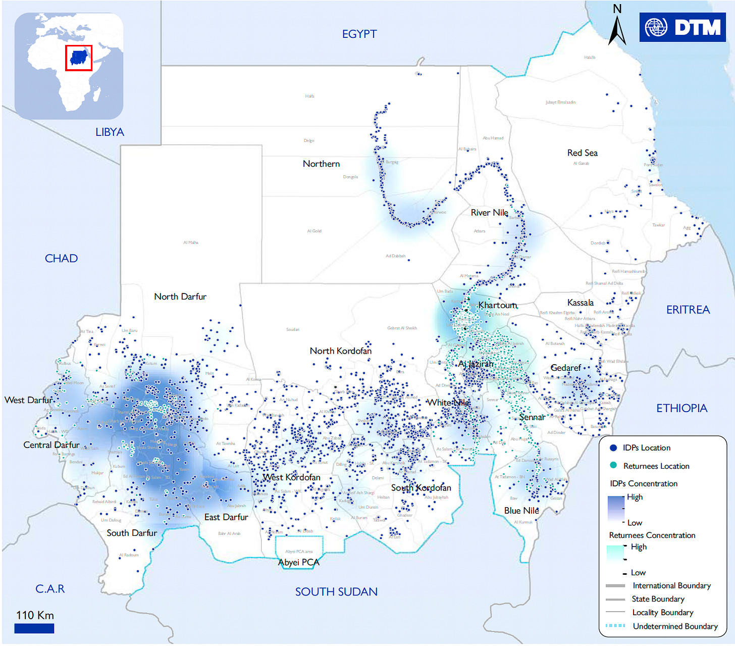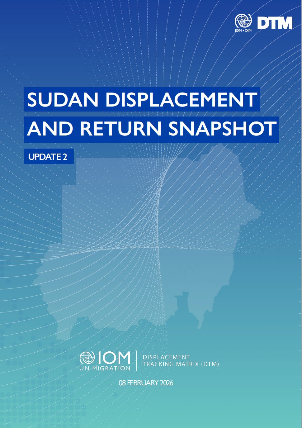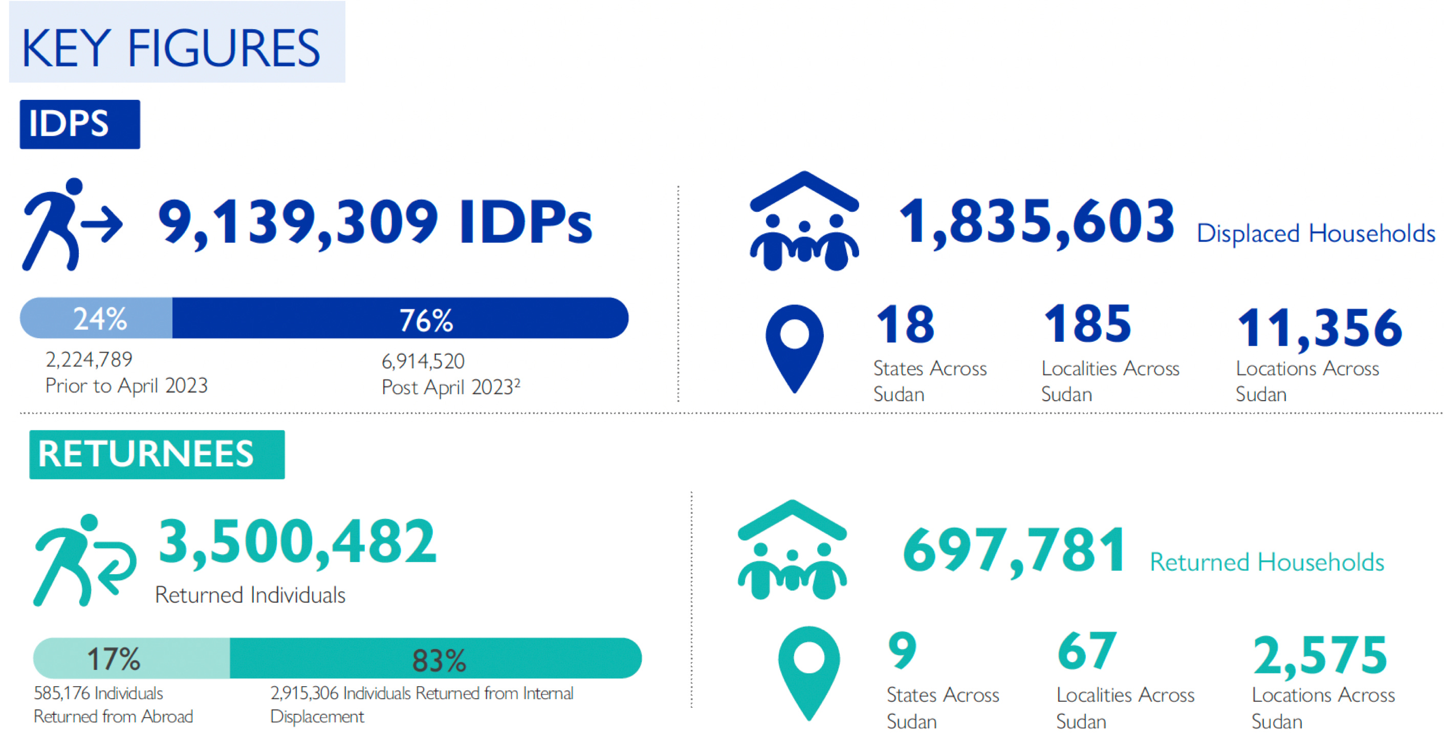 تشير اخر اصدارة للمنظمة الدولية للهجرة الى معلومات عن النازحين داخليا والعائدين، استناداً إلى بيانات من أكثر من 12000 موقع، و185 منطقة محلية، وجميع الولايات الـ 18 في السودان.