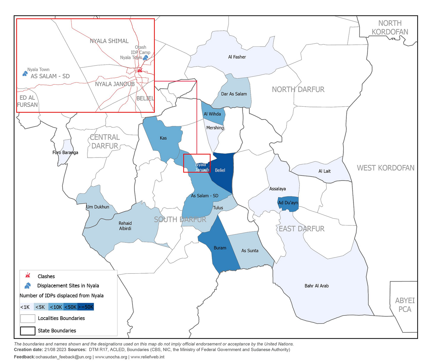 حسب مصفوفة تتبع النزوح (Displacing Tracking Matrix) التابعة للمنظمة الدولية للهجرة، اشارت تقاريرها الاولية إلى أن ما يقرب من 10,000 أسرة – حوالي 50,000 شخص – فروا من منازلهمن في أحياء المزاد، وطيبة وسكة حديد، والجبل، وكرري، وموسى وتكساس في مدينة نيالا إلى حي الجير، والنهضة، والسلام والكنغو.