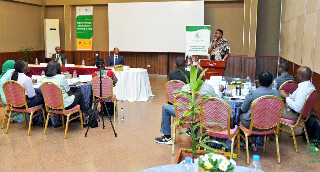 أحد أهم الأهداف الرئيسية ضمن الاستراتيجية الإقليمية للهيئة الحكومية الدولية المعنية بالتنمية (IGAD) للوقاية من التطرف العنيف ومكافحته هو إنشاء منصات للتعاون والتنسيق بين الجهات الفاعلة الرئيسية المعنية بمنع التطرف العنيف ومكافحته (P/CVE) في أنشطة مصممة لتمكين، وتعزيز الأصوات الموثوقة القادرة على تحدي وتغيير تصورات المنظمات المتطرفة العنيفة، وأيديولوجياتها للحد من خطر تطرف المجتمعات المعرضة للعنف، نُظمت ورشة العمل الاستراتيجية للتواصل من اجل تحقيق هذا الهدف.