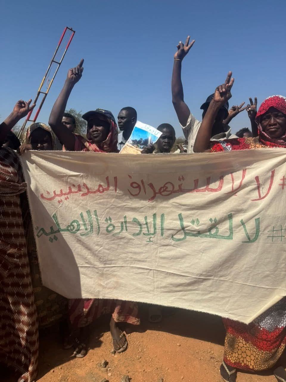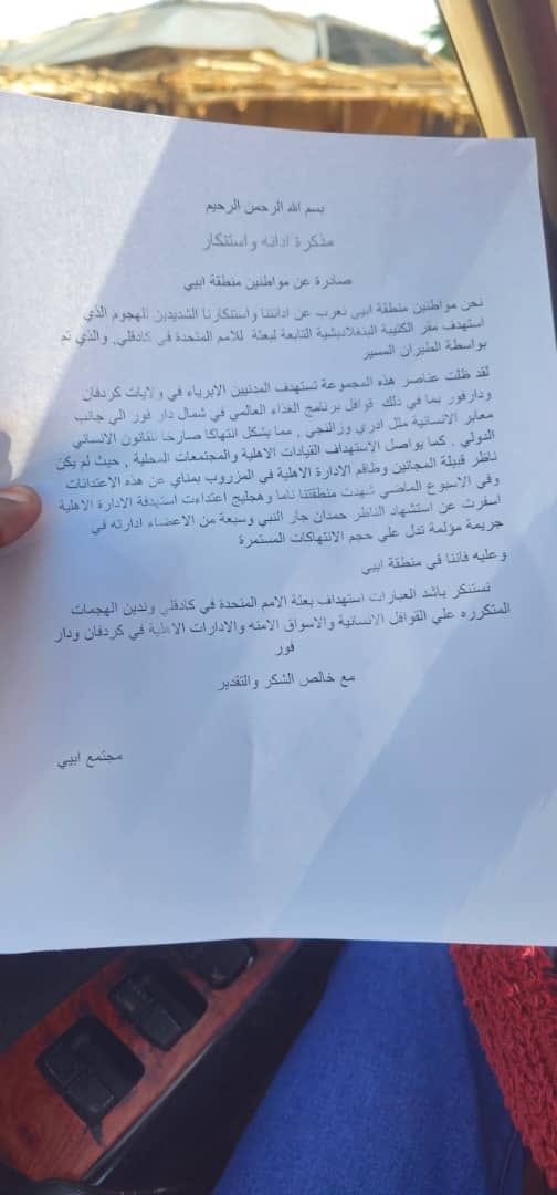 خرج مواطنوا منطقة الداير شمال أبيي اليوم الإثنين الموافق ١٥ ديسمبر ٢٠٢٥م فى مسِيرةٍ احتجاجية، وقاموا بتسليم قائد القوات الأممية لحفظ السلام مُذكرةُ شجبٍ واستنكار لقصف مقر البعثة الأممية بمدينة كادقلى بالمُسيَّرات الإستراتيجية، وأشاروا بأصابعِ الاتهام لمجموعة الإخوان المسلمين بالجيش ، مُشيرِينَ لسوابقهم فى استهداف قادةُ الإدارة الأهلية بالمُسيَّرات فى ولايات دارفور وكردفان، واستهداف القوافلُ الإنسانية والأسواقُ الآمنة.