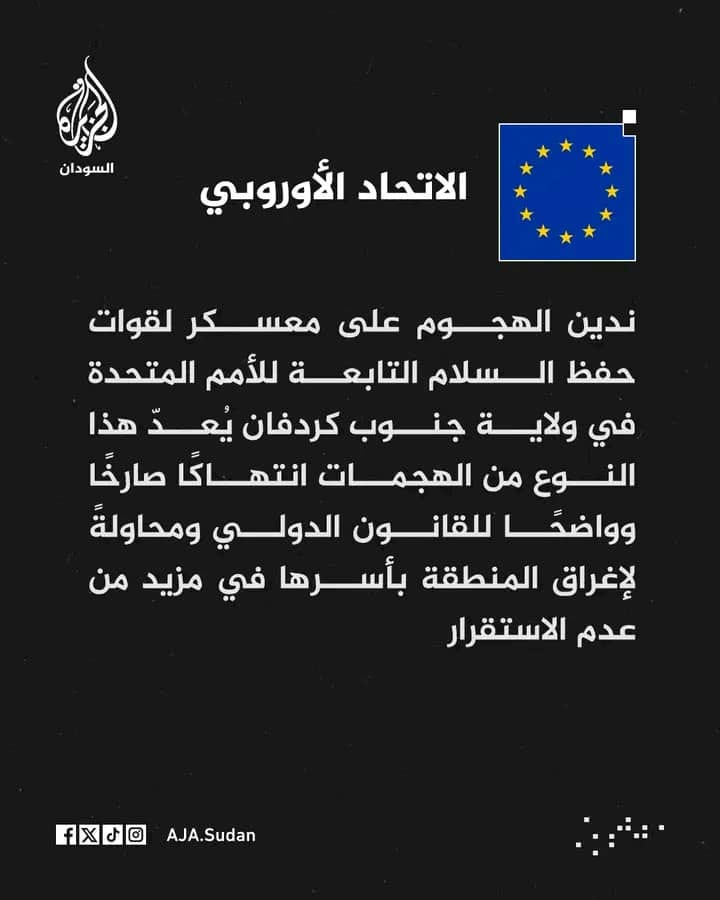 أما الاتحاد الأوروبى ، فأدان الهجوم على مقر البعثةُ الأممية لحفظ السلام بمدينة كادقلى، ووصفه بالانتهاك الصارخ والواضح للقانون الدولى ومحاولةٌ لإغراق المنطقة بأسرها فى مزيدٍ من عدم الإستقرار.