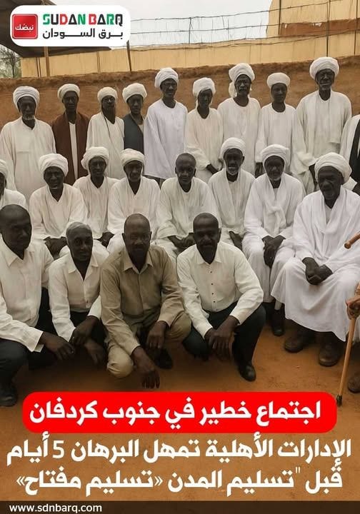 عقدت الإداراتُ الأهلية بإقليم جنوب كردفان / جبالُ النوبة صبيحة اليوم الإثنين الموافق ١٥ ديسمبر ٢٠٢٥م اجتماعاً طارئاً مع قيادات الفرقة ١٤ مشاة بكادقلى وحامية الدلنج مقر اللواء ٥٦، وسلّمتهم مُذكرّةً شديدةُ اللهجة مُوجّهة لرئيس المجلس الانتقالى الفريق أول ركن عبدالفتاح البرهان مع امهاله مدة خمس أيام للردِّ على المُذكِّرة.