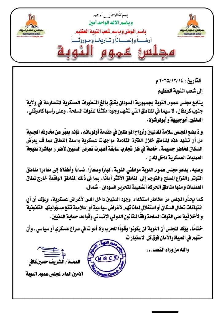 وفى ذاتِ السِّياق، دعى مجلسُ عمومِ النوبة فى بيانٍ صدرَ بتأريخ الأحد الموافق ١٤ ديسمبر ٢٠٢٥م عن العمدة الشريف حسين كافى، الأمينُ العام للمجلس، دعى مواطنى النوبة كباراً وصغاراً ، نساءً وأطفالاً، إلى مغادرةِ مناطق التوتر والنزاع المسلح والتّوجه إلى المناطقِ الأكثر أماناً، بما فى ذلك المناطق الواقعةُ خارج نطاق العمليات العسكرية ومنها مناطقُ الحركة الشعبية لتحريرِ السودان / شمال.