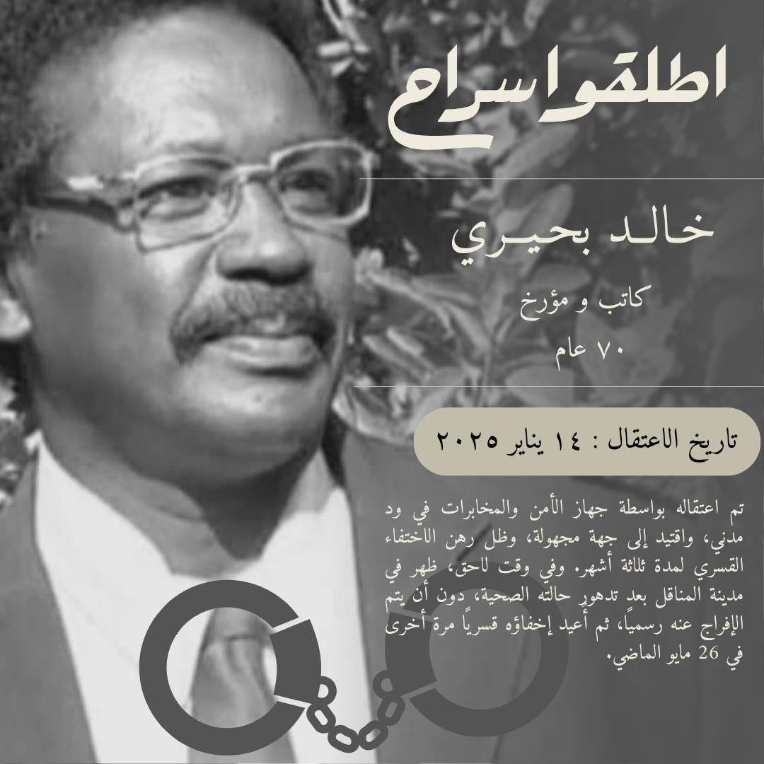 وأكدت مجموعة محامو الطوارئ استمرار اعتقال جهاز الأمن والمخابرات العامة بمدينة ود مدني الكاتب والمؤرخ المعروف خالد بحيري من منزله في 14 يناير 2025.