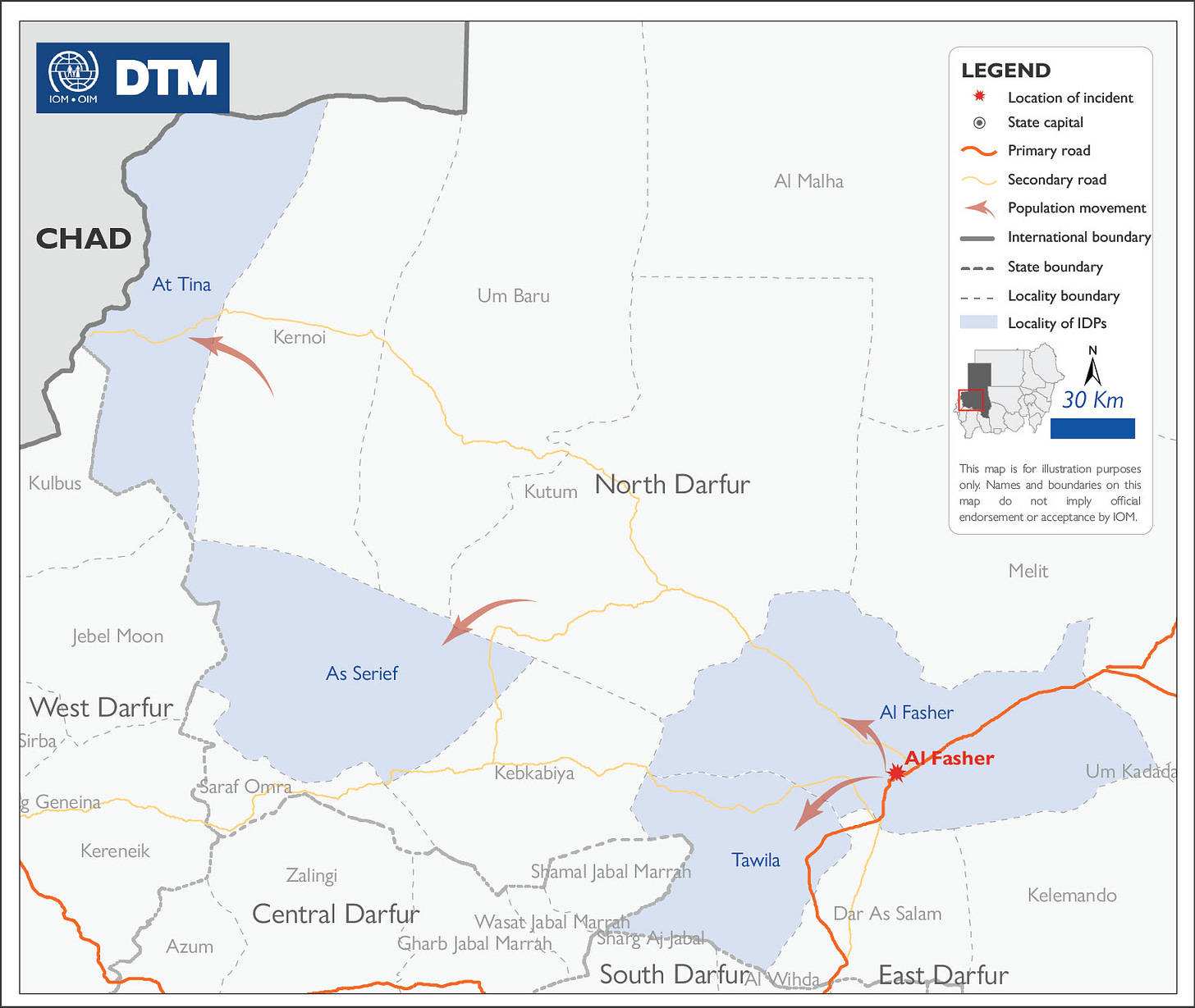 قدّرت الفرق الميدانية لمصفوفة تتبع النزوح أن 389 اسرة نزحت في الثاني والرابع والعشرون من يونيو 2025، من مخيم أبو شوك للنازحين في مدينة الفاشر، شمال دارفور، بسبب تدهور الاوضاع الامنية والاقتصادية.