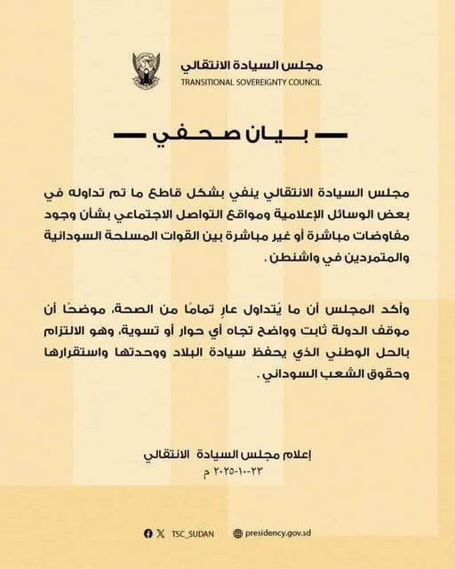 نفي مجلس السيادة الانتقالي بشكل قاطع قاطع ما تم تداوله في بعض الوسائل الاعلامية ومواقع التواصل الاجتماعي بشأن وجود مفاوضات مباشرة أو غير مباشرة بين القوات المسلحة السودانية والمتمردين في واشنطن.
