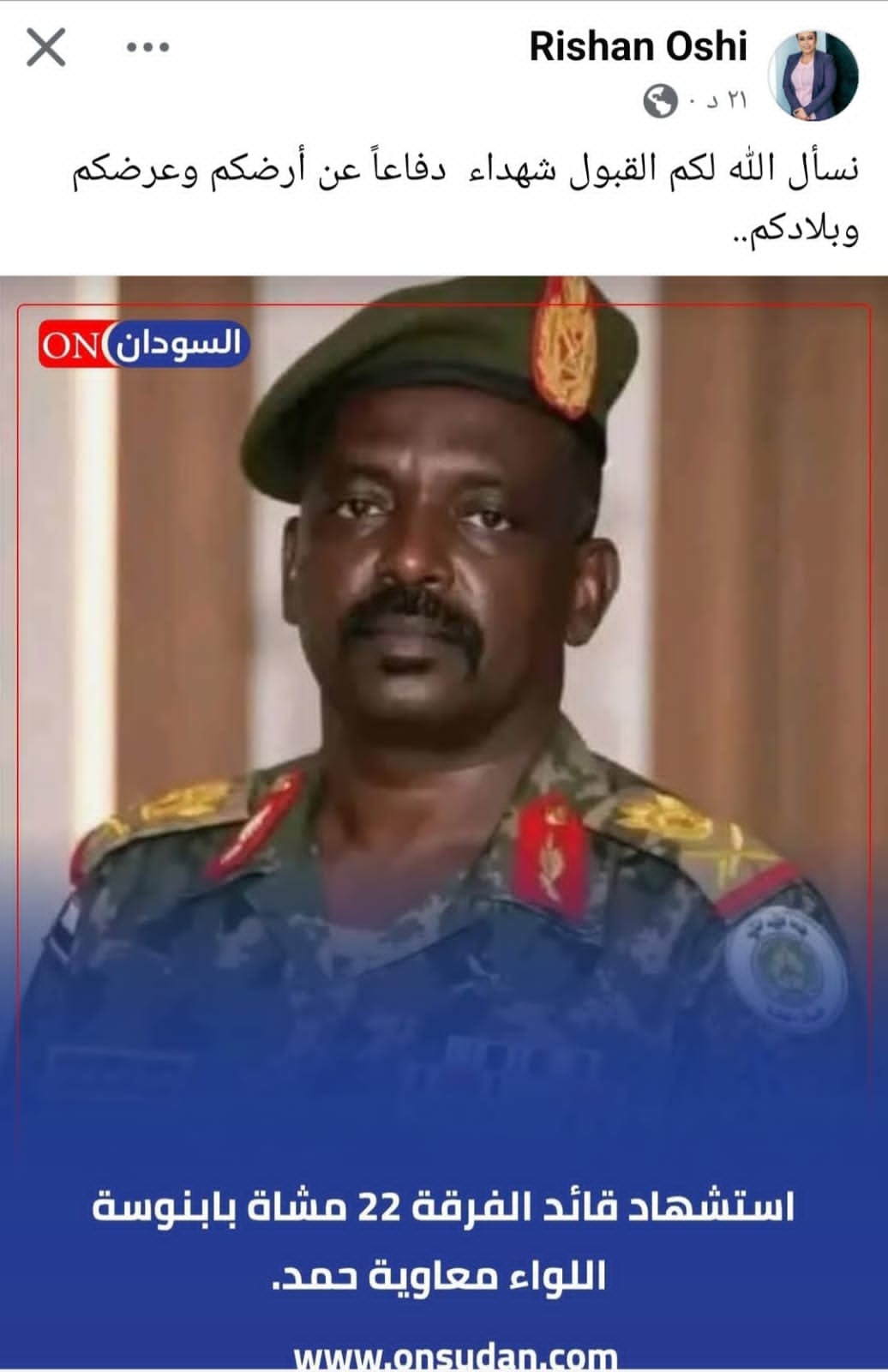 استناداً على نعىٍّ رسمى نشره رفاقُ الدفعةَ ٤٠ بالكليةِ الحربية، أعلنتْ أسرةُ اللواء ركن معاوية حمد عبدالله قائد الفرقة ٢٢ مشاة ببابنوسة فى بيانٍ لها بتأريخ الثلاثاء ٣٠ ديسمبر ٢٠٢٥م ، استشهاده وذلك تأكيداً لخبرِ مقتلهِ الذى انتشر منذ اليوم الأول لسيطرةِ قوات الدعم السريع على الفرقة فى الأولِ من ديسمبر ٢٠٢٥م الماضى.