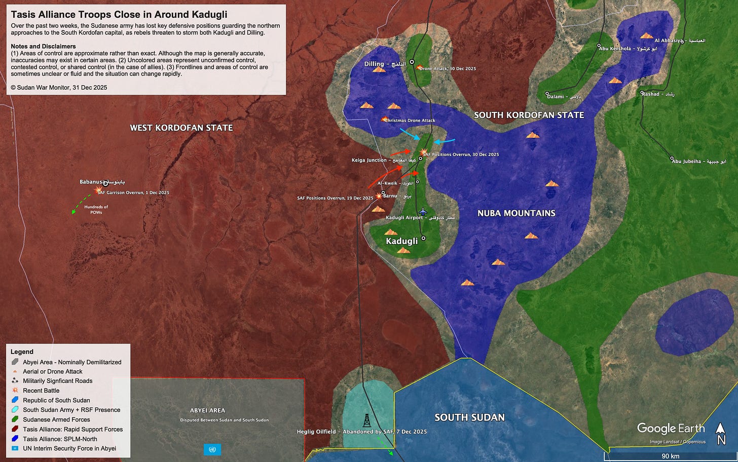 In the latest developments, on Tuesday morning, 30 December 2025, a joint operation by the RSF and the Sudan People’s Liberation Movement (North) overran Sudanese Armed Forces (SAF) positions along the Kadugli-Dilling road, including at Keiga Junction, Balif, and Hajar Daleib. This puts them within easy striking distance of Al-Kweik, Kadugli Airport, and Kadugli itself.