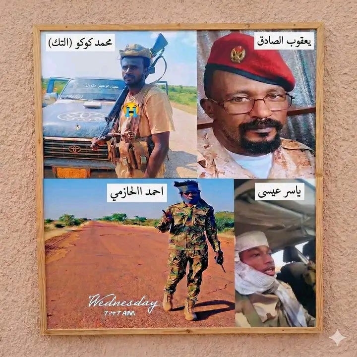 وأضاف المصدر أنّ طيران الجيش تدخّل فى الوقت المناسب وشنّ غاراتٍ مكثفة أدّت لتشتيتِ القوة المهاجمة وفقدانها لقادةٍ بارزون أبرزهم قائد القوة المهاجمة يعقوب الصادق محمد قائد المجموعة ٣٦ وشقيق القائد ماكن الصادق محمد الذى قُتِلَ بتأريخ الإثنين ٨ سبتمبر ٢٠٢٥م الماضى بمنطقة كازقيل بولايةِ شمال كردفان، بالإضافة إلى القادة الآتيةُ أسمائهم :
