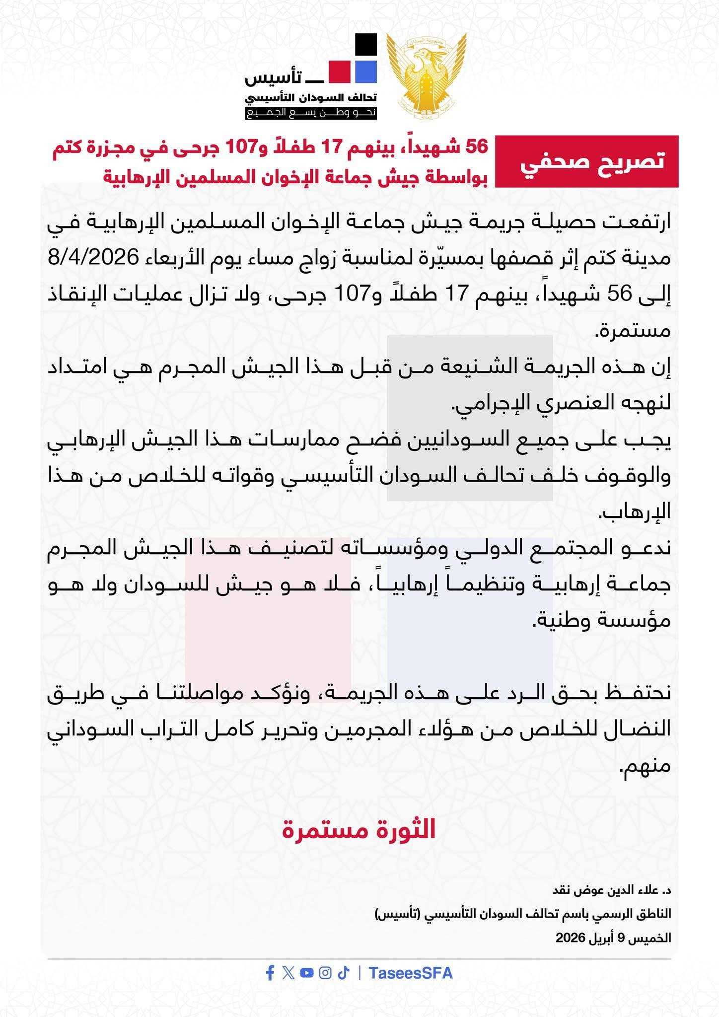 أكد الدكتور علاء الدين عوض نقد الناطق الرسمي لتحالف السودان التأسيسي (تأسيس) ارتفاع مجزرة كتم بولاية شمال دارفور التي نفذها طيران الجيش السوداني يوم الأربعاء 8 أبريل 2026، الى 55 شخصا بينهم 17 طفلا و107 جريحا.