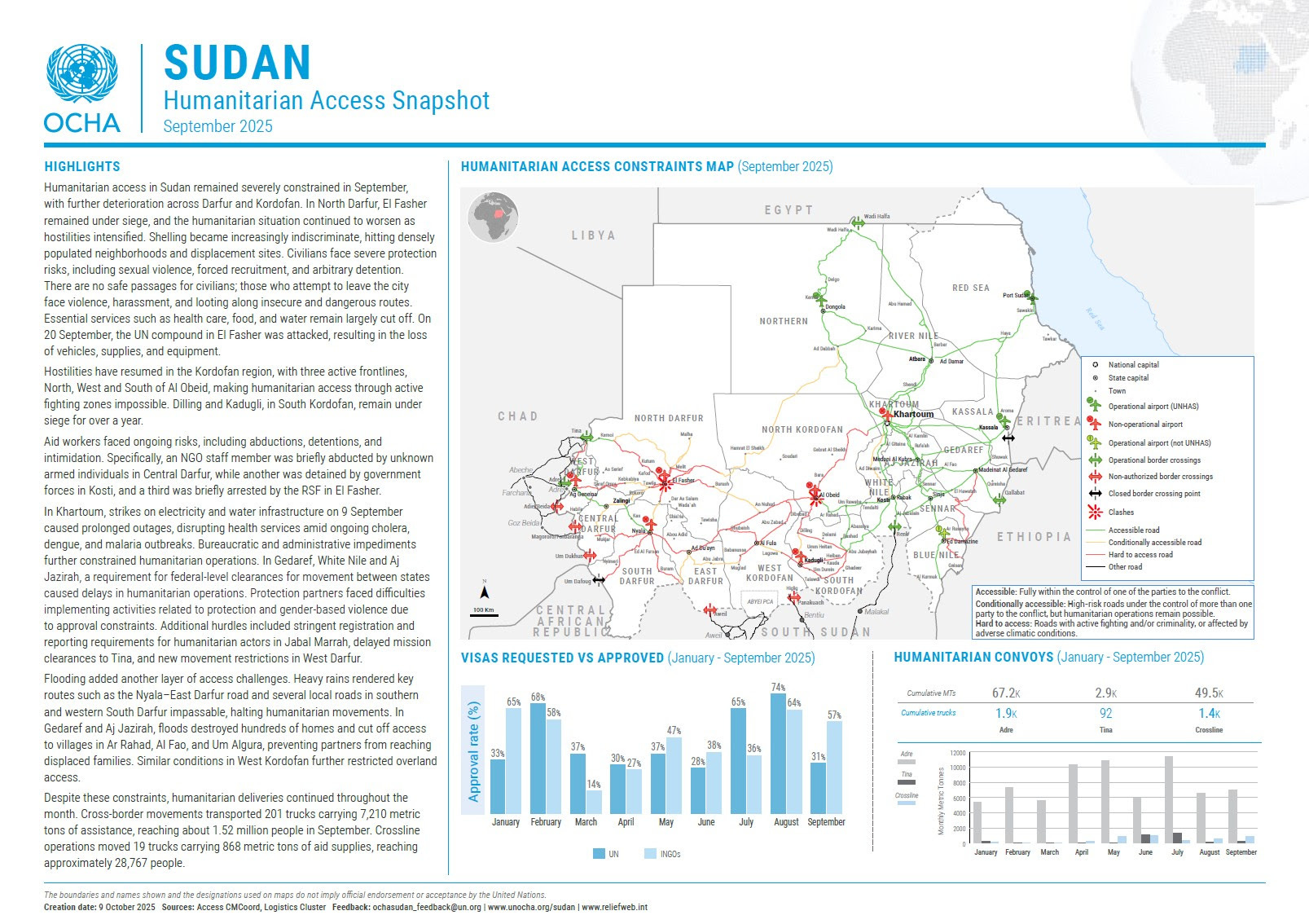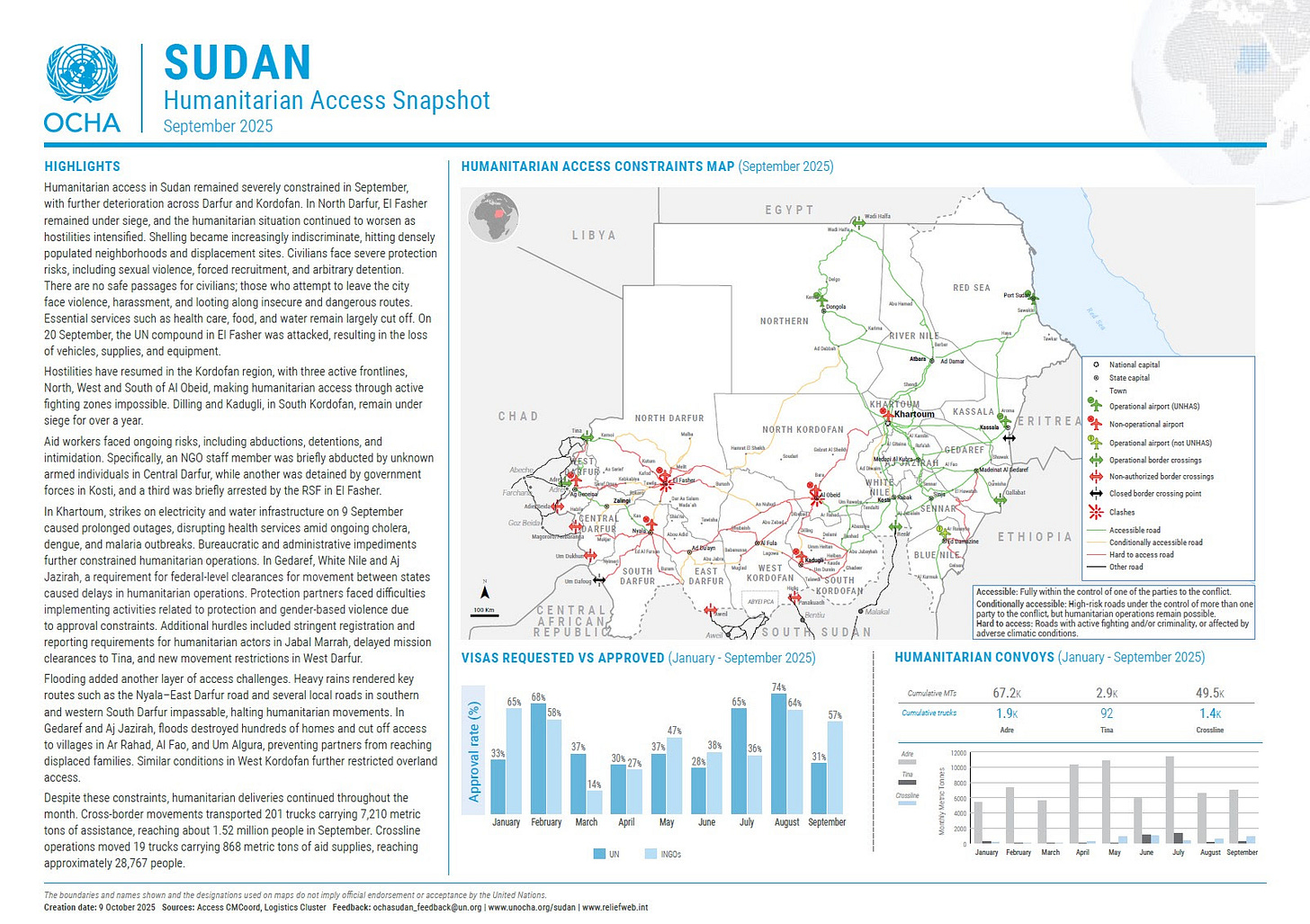 ظل وصول المساعدات الإنسانية إلى السودان مُقيّدًا بشدة في سبتمبر، مع تفاقم الوضع في دارفور وكردفان، قال مكتب الأمم المتحدة لتنسيق الشؤون الانسانية ’’ اوتشا ‘‘ في شمال دارفور، ظلت مدينة الفاشر تحت الحصار، واستمر الوضع الإنساني في التدهور مع اشتداد الأعمال العدائية.