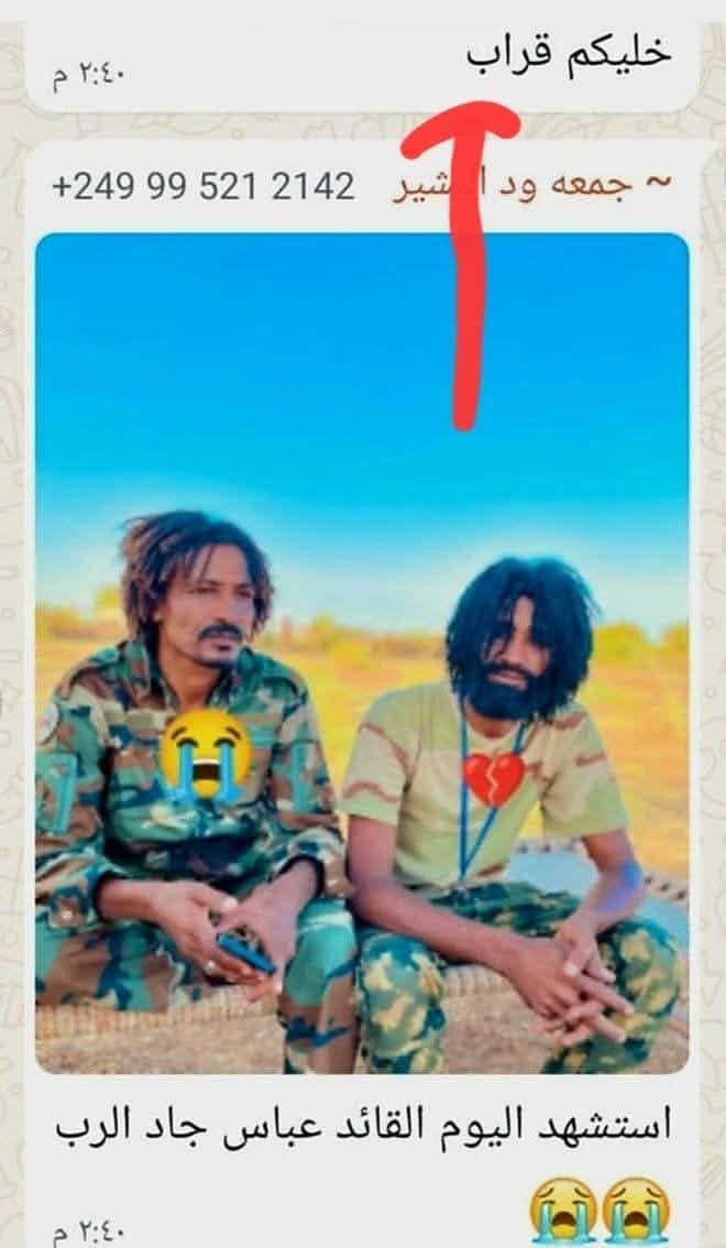 ارتفعت حصيلةُ قتلى وجرحى المواجهات غير المباشرة بين الجيش والدعم السريع الذين ظلّا يعتمدان طيلة الأيام الست الماضية على تبادل التدوين بينهما بالمدفعية الثقيلة والمُسيَّرات الإستراتيجية، وأسفر التبادل المدفعى بين الطرفين يوم السبت الموافق ١٥ نوفمبر ٢٠٢٥م عن مقتل الآتية أسماءهم من قوات الدعم السريع :-