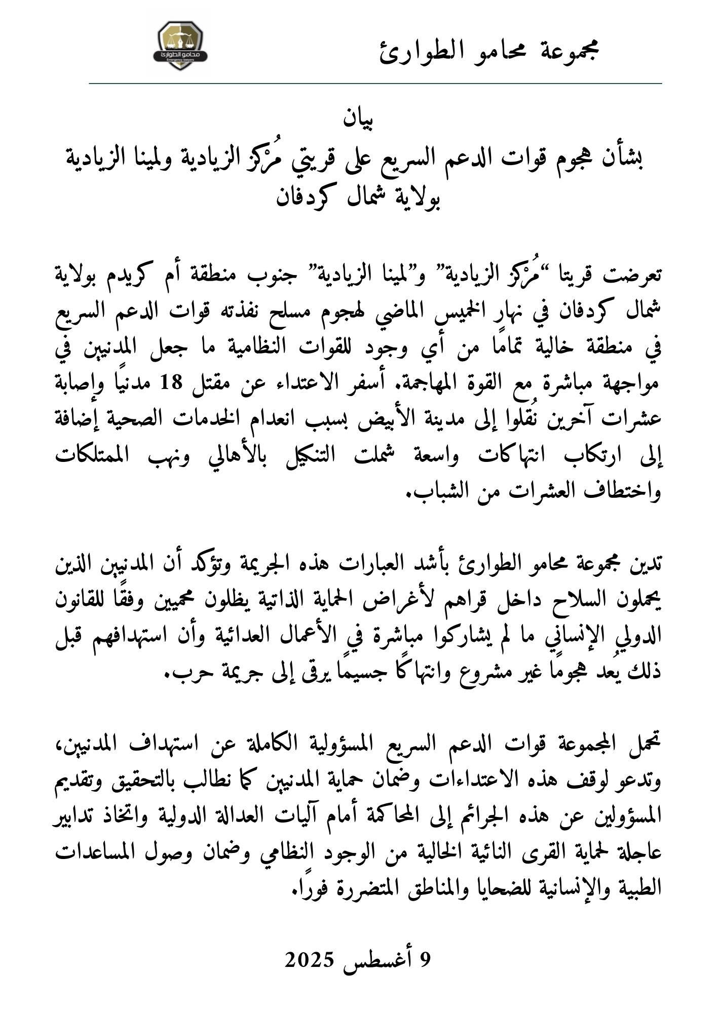 اكدت مجموعة محامو الطوارئ في بيان الصادر يوم السبت 9 أغسطس 2025، تعرض قريتا “مُرْكز الزيادية” و”لمينا الزيادية” جنوب منطقة أم كريدم بولاية شمال كردفان في نهار الخميس 7 أغسطس لهجوم مسلح نفذته قوات الدعم السريع.