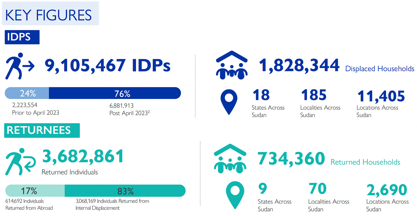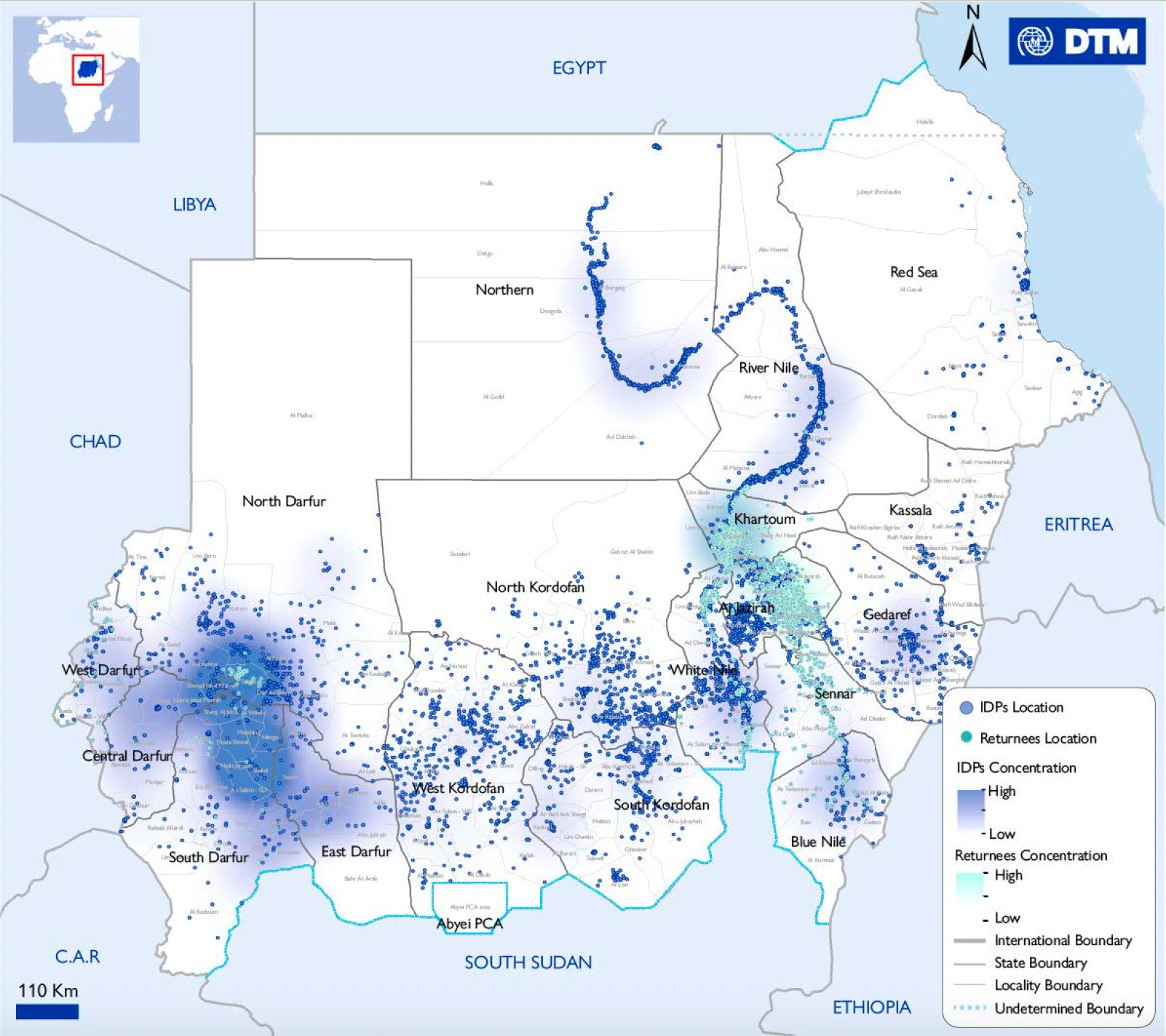 قدم تقرير مصفوفة تتبع النزوح التابعة للمنظمة الدولية للهجرة، الموجز عن النزوح والعودة في السودان بياناتٍ عن النازحين داخلياً والعائدين من أكثر من 12,000 موقع، و185 منطقة محلية، وجميع ولايات السودان الثماني عشرة.