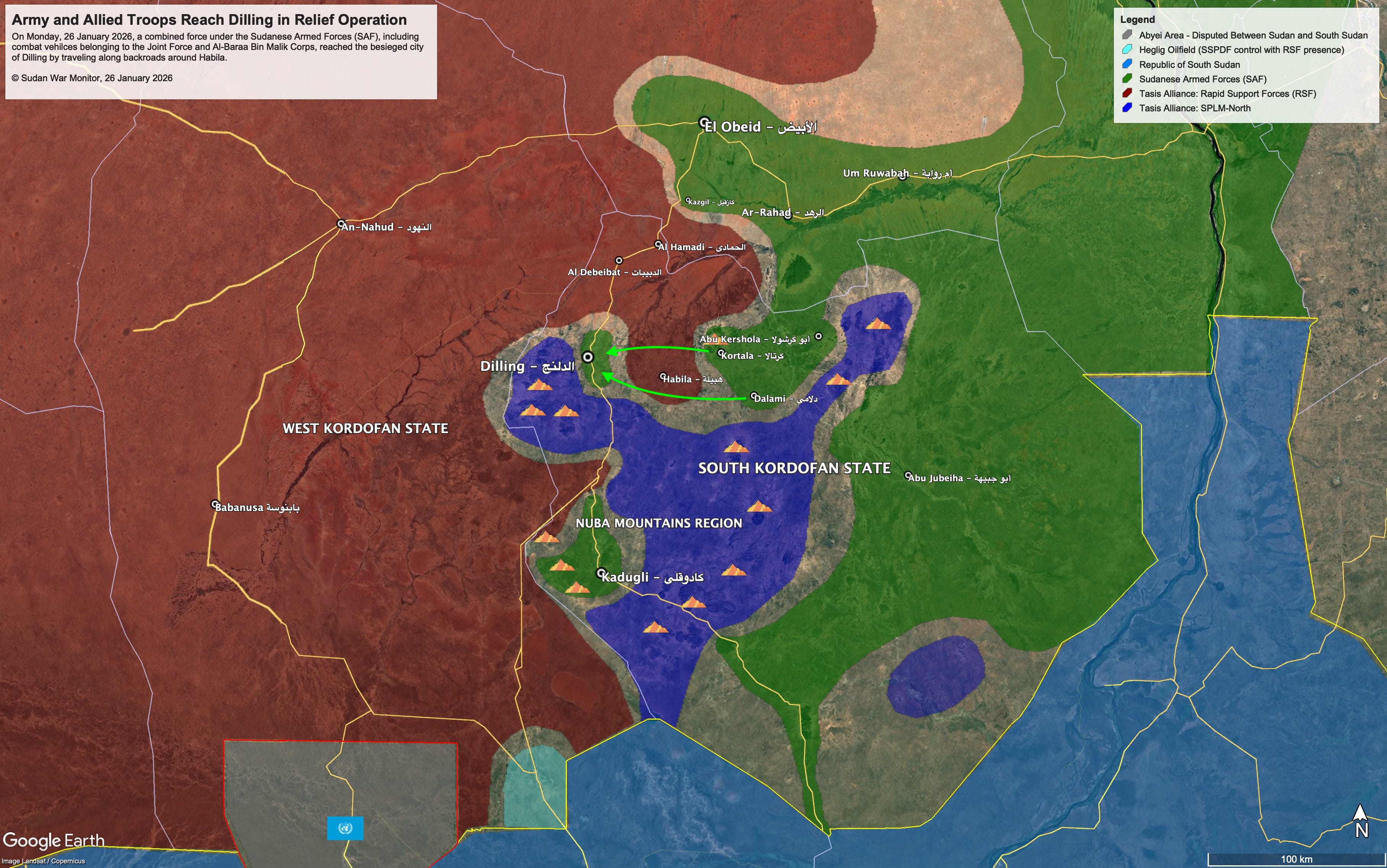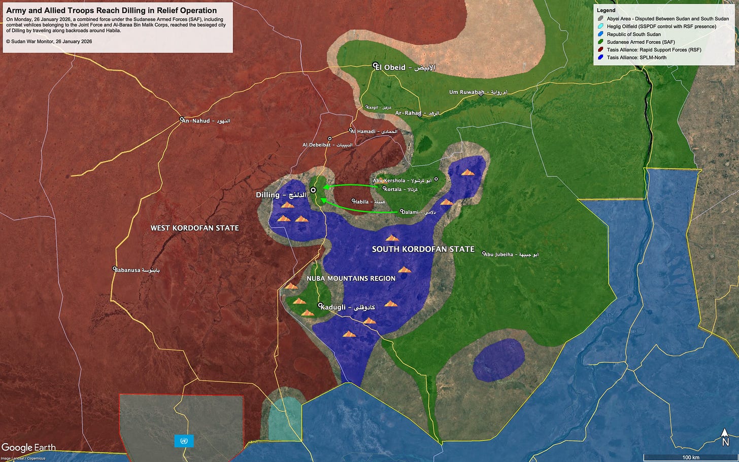 The main highway to Dilling remains contested and unusable for either military logistics, humanitarian relief, or general trade. But the siege’s outer ring has been punctured, altering the tactical balance around Dilling and complicating RSF efforts to maintain total isolation of the city.