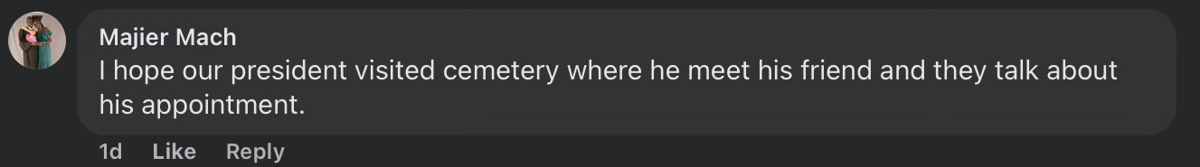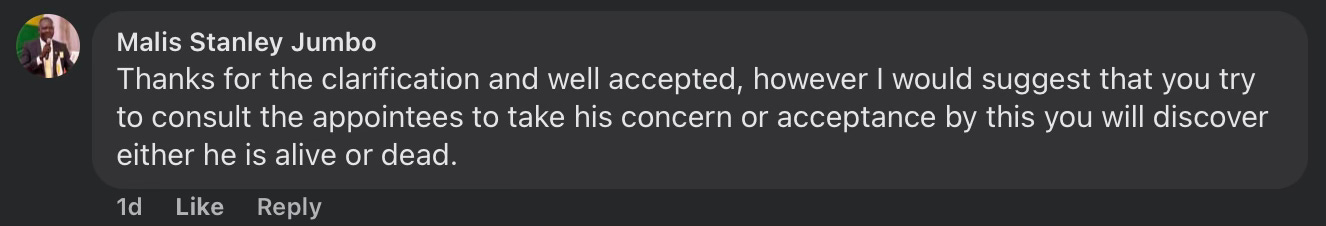 David Majur, the president’s press secretary, called the appointment of late Hon. Sorobo an “unfortunate administrative oversight.” In a statement Monday, he deflected blame for the incident onto unnamed “stakeholders”: